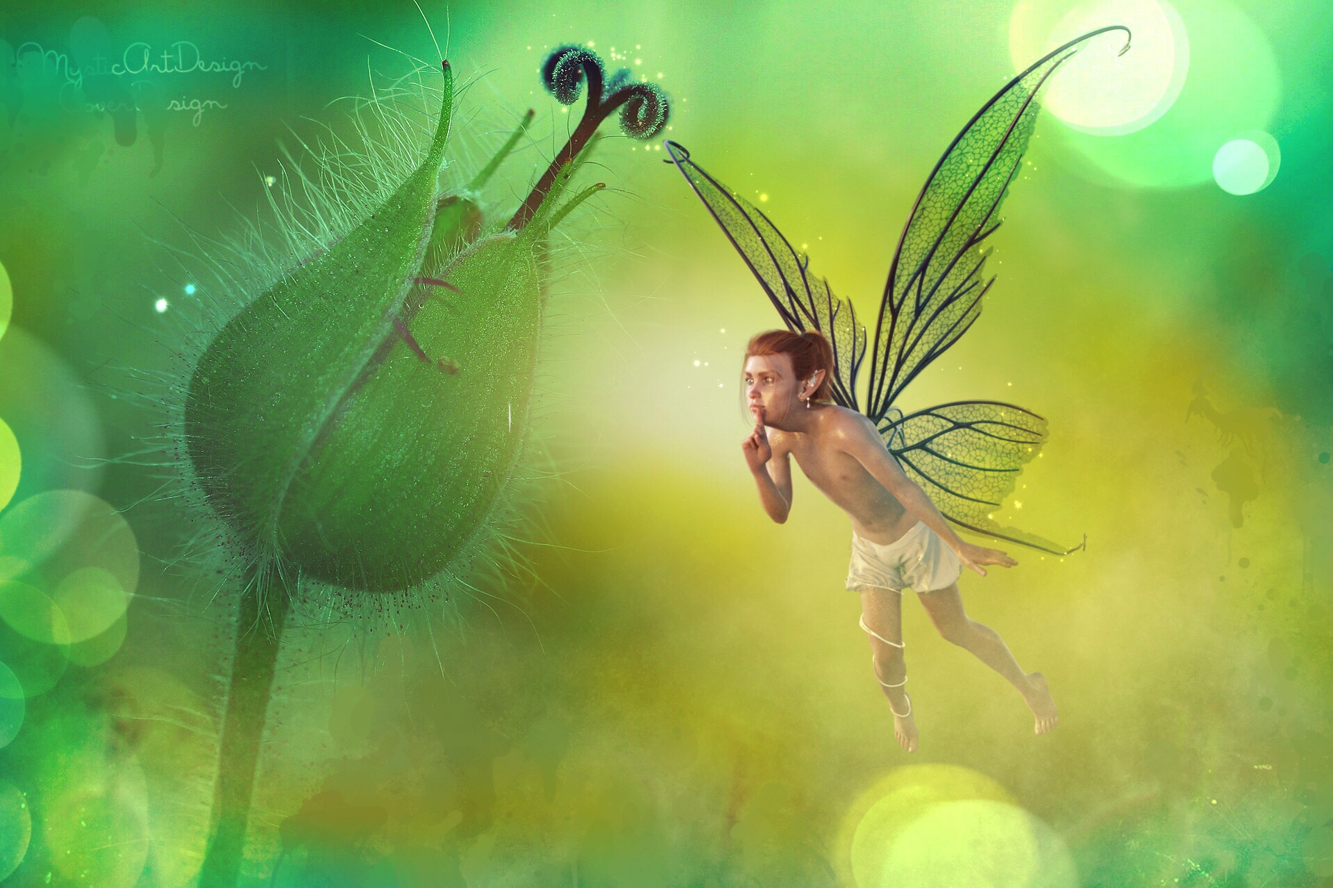 und ja, dier Elf scheint darüber nachzudenken, welches Wesen sich da wohl in der Knospe versteckt hat..