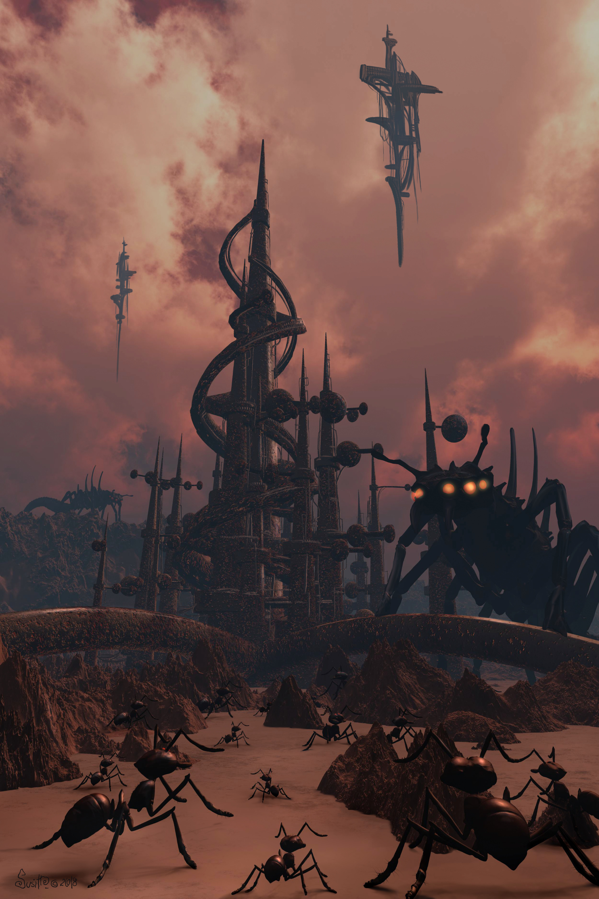 Dieses Bild hat aus unerfindlichen Gründen Ewig gedauert und war danach eher mittelmässig. Die Ameisen hatten alle keinen Schatten, den musste ich noch reinmalen. auch der Himmel sah noch ziemlich langweilig aus. Ich hab dann einfach noch ein paar weitere schwebende Raffinerien reingemalt und nun bin ich einigermaßen zufrieden.