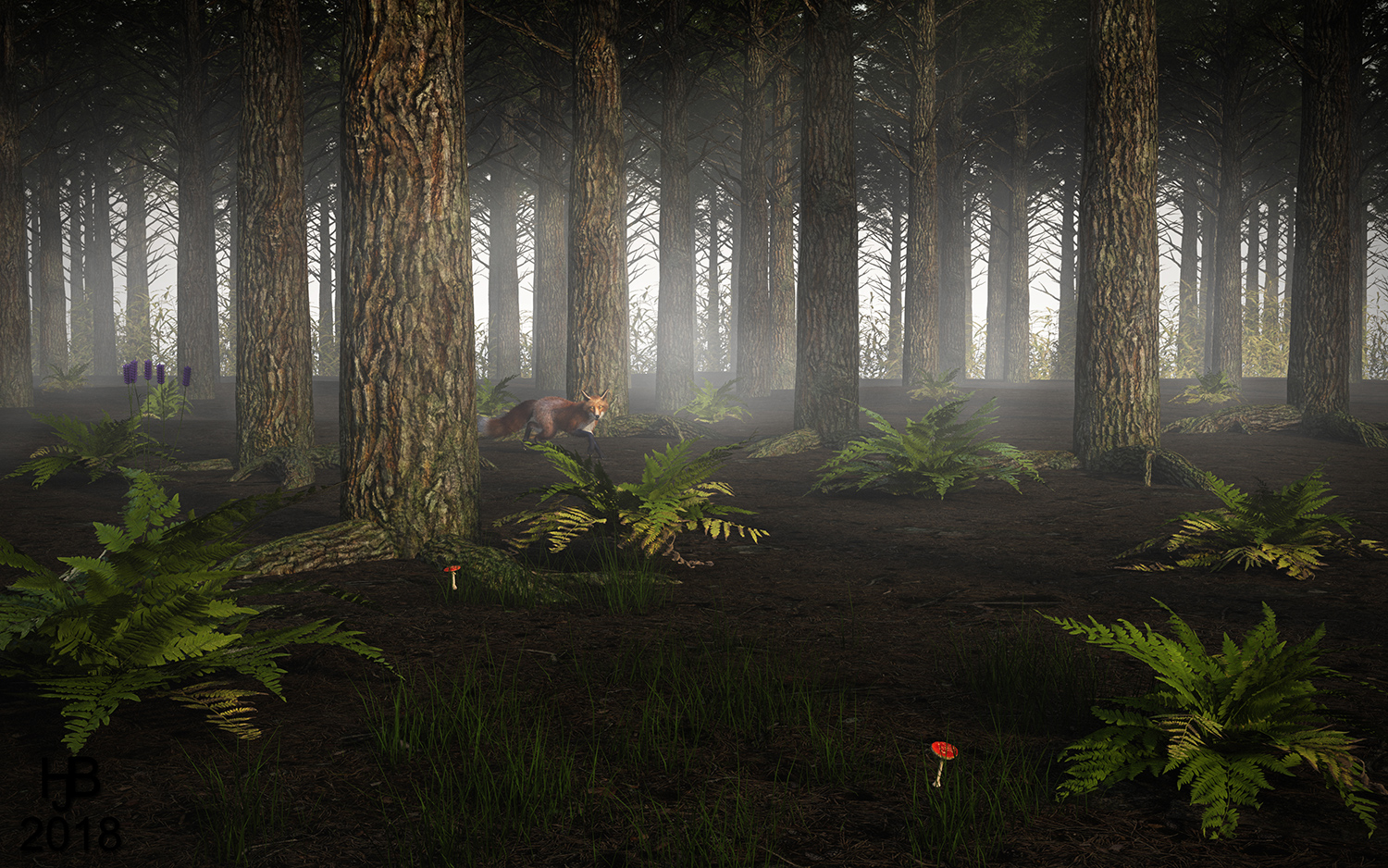 . Etwas unrealistisch ist die Farnverteilung. Der würden mir auch in Gruppen besser gefallen. Das sieht auch sehr nach Nadelbaum-Monokultur aus. VieleNadeln auf dem Boden. Die benutzte Textur ist sehr gut. Da wächst für gewöhnlich fast nichts. Eher mehr am Waldrand oder auf Lichtungen.