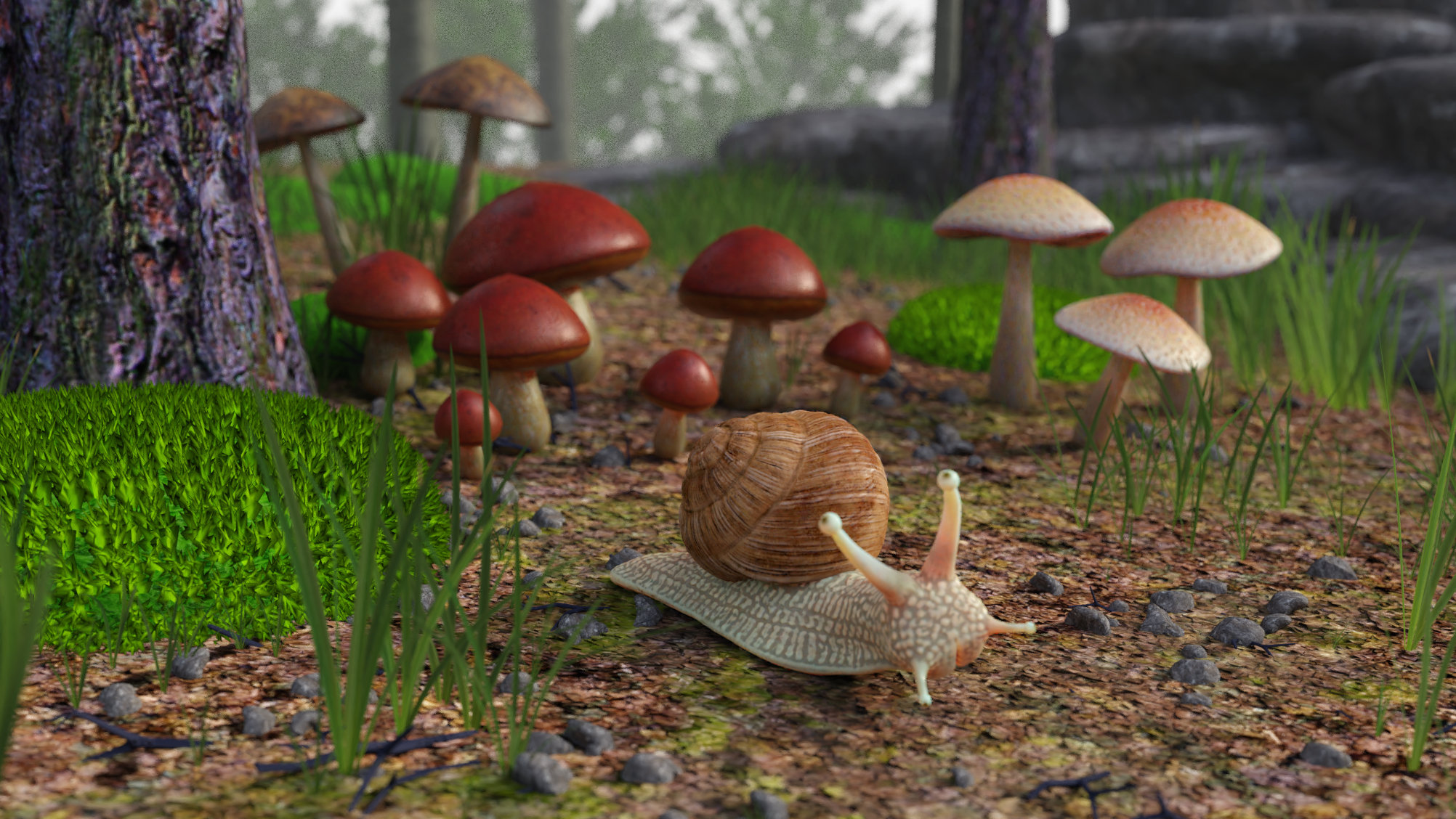 Pilze und Bäume sind alte Game Assets die ich seinerzeit noch mit trueSpace gebaut habe. Der Rest ist in Bforartists entstanden. Schnecke samt Schneckenhaus, Gras, die Felsen und Steinchen, Moos. Gerendert ist das Ganze mit Cycles.