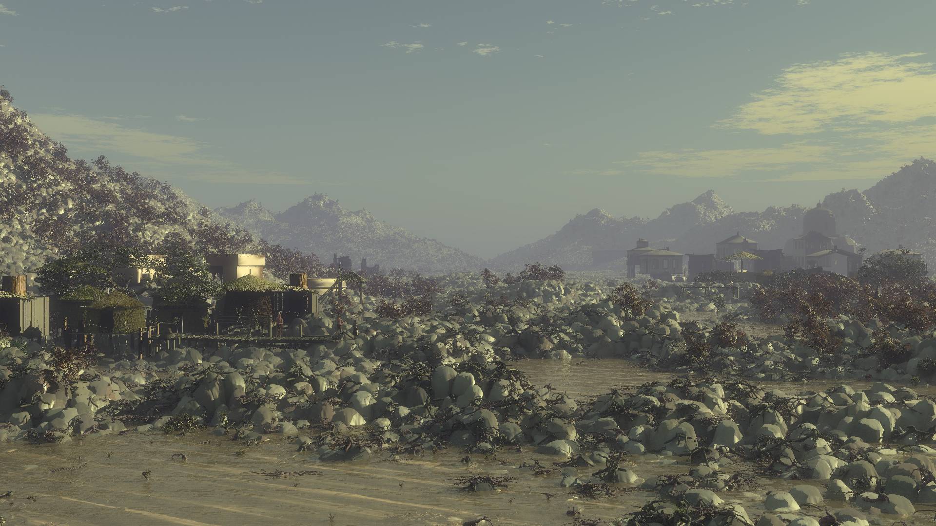 Neues Flussmotiv. Das mit den nassen Steinen klappt noch nicht ganz. Der Funktionseditor macht nicht das was ich will aber es geht voran.