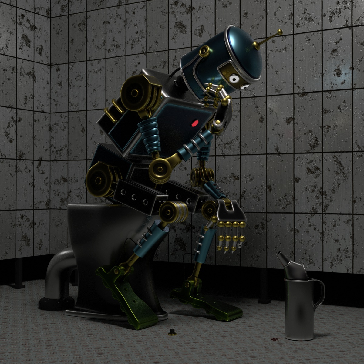 . Ja, keine Ahnung worüber der so vor sich hin sinniert. Auf jeden Fall sah ich einen ähnlichen auf einem Stockfoto, als ich Inspiration für das Thema suchte. Der saß auf einem Barhocker und stierte vor sich hin und ich hatte den sofort auf einer Toilette sitzend im Kopf. Damit es nicht so leer aussah, kam mir dann noch die Idee mit der Schraube, der Ölkanne und dem rotem Licht. War ein schönes Thema und hat Spaß gemacht den zu bauen.