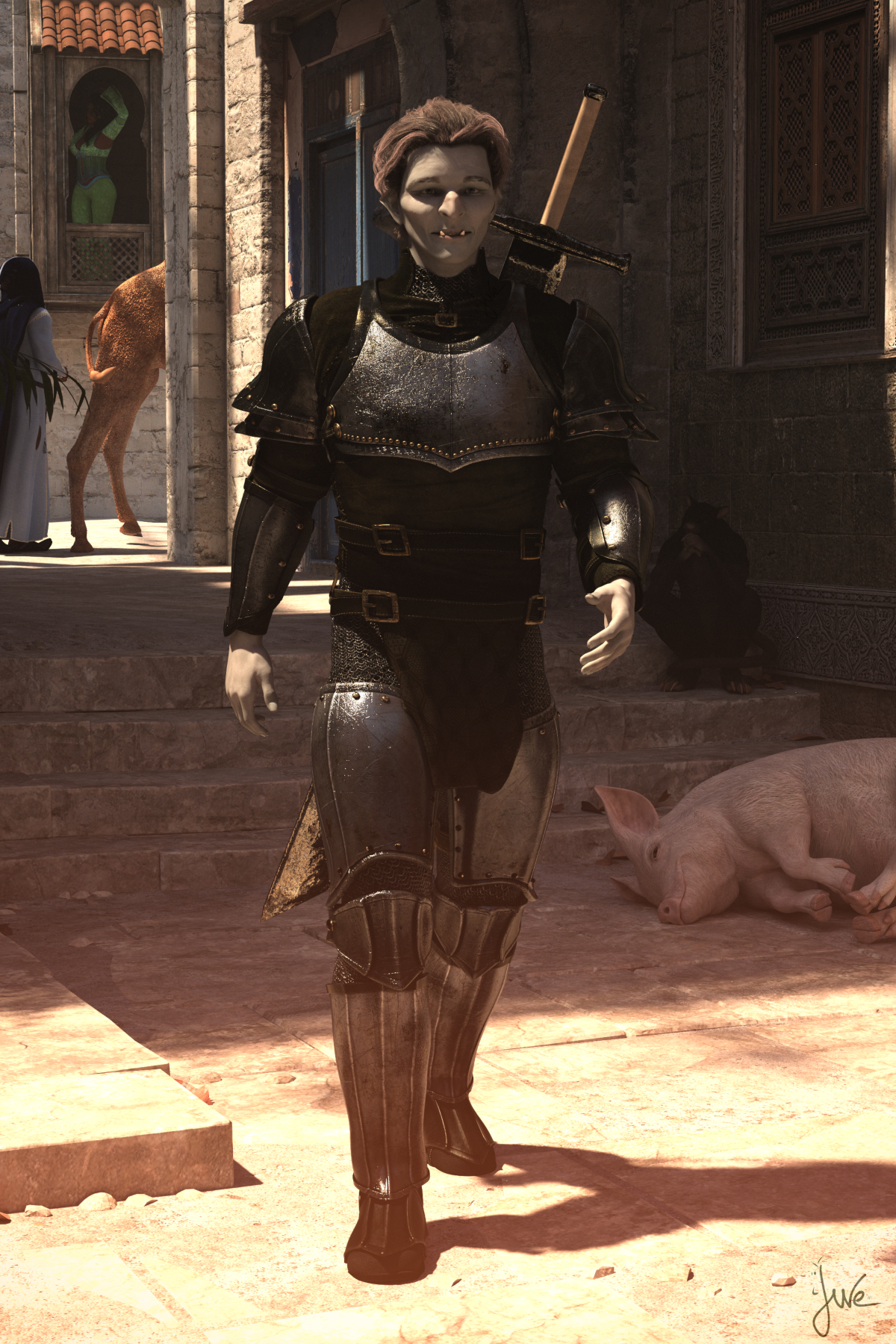 Die verwinkelten Gassen von Katapesh blieben in der Mittagshitze meist leer. Ein Schwein suhlte sich im Staub, das Gesicht fast schon zu einem zufriedenen Lachen verzogen. Aziz wusste, dass er hier in vollem Ornat viel zu auffällig gewesen wäre, also hatte er nur seine Rüstung anbehalten, ohne den weiß-blau-goldenen Überwurf. Sein Großschwert zurückzulassen wäre dem Paladin jedoch nie in den Sinn gekommen - da hätte er gleich nackt gehen können. So blieb er noch auffällig genug für die vielen neugierigen und teils feindseligen Blicke aus den Schatten.
