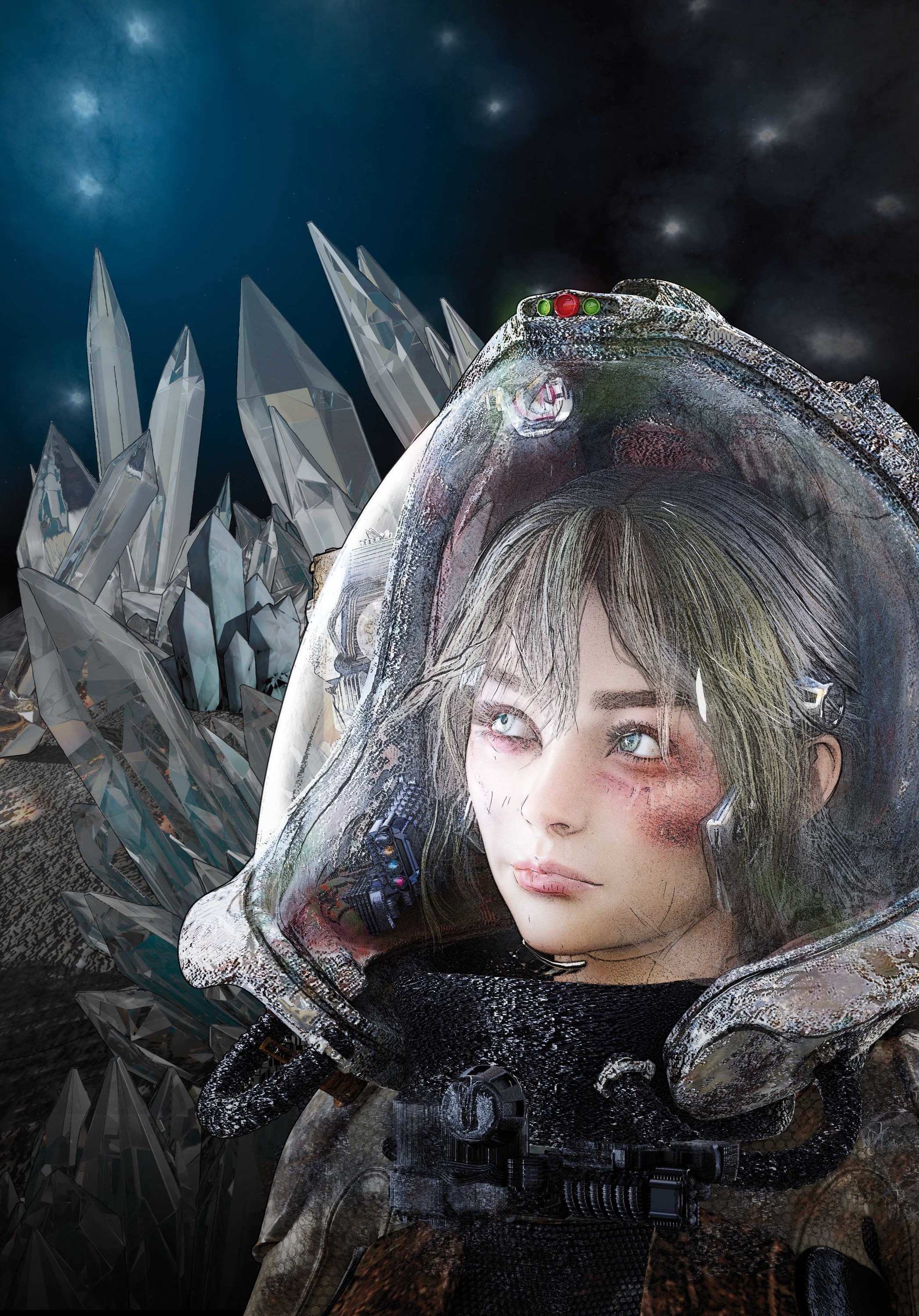 Meine letzte Illustration für den 2015 verstorbenen Autor Alexander Kröger.Verwendet: DAZ Studio (V 8 und div. Clothings), ein freies Modell des etwas modifizierten SciFi-Helmes von Tristan Gruet (The Pixel Lab) in C4D, die Kristalle sind div Poser-Modelle, gerendert in Vue. Postwork in Photoshop, die Outlines vektorisiert und etwas nachbearbeitet in Clip Studio Paint.