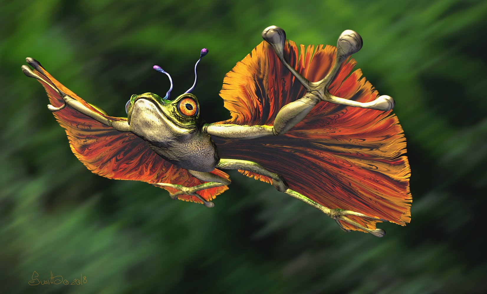 Gleitfrösche bilden auf Ari Moon eine artenreiche Familie und es gibt sie in vielen verschiedenen Farben und Formen. Eine der schönsten Gleitfroscharten ist der große Feuergleiter der zum Glück wie die meisten Gleitfrösche, undgiftig ist. Die Tiere von einer Größe bis zu 35cm können weite Strecken zwischen den Bäumen, gleitend zurücklegen.