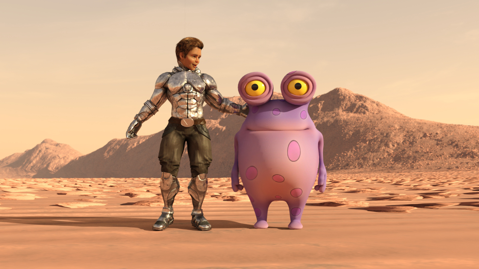 Ich wollte noch ein gelandetes Raumschiff weit hinten links anbringen, aber es war durch das HDRI bedingt nicht möglich, es auf die gleiche Höhe zu stellen wie die Figuren.