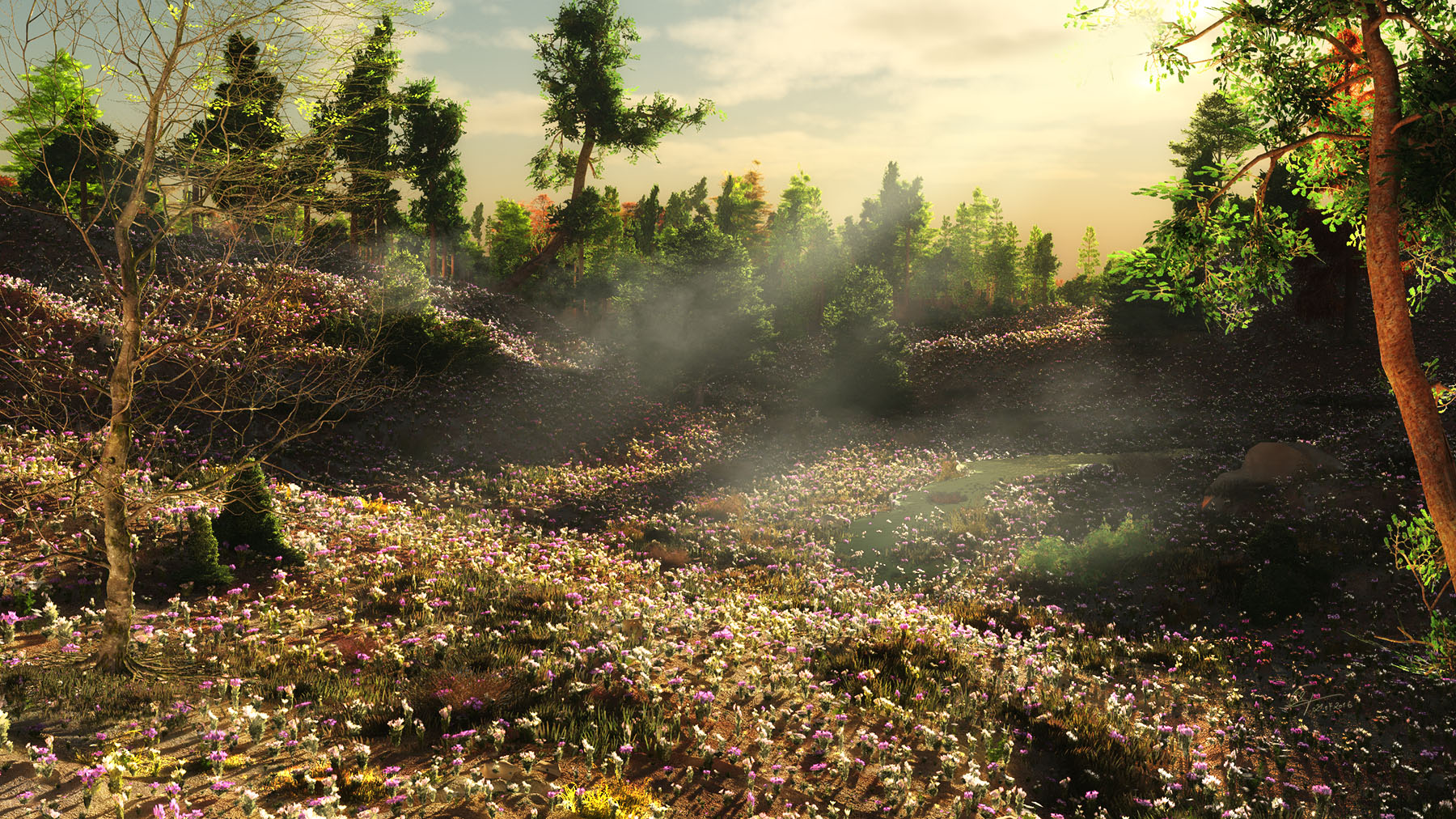Anm.: Die beiden Bäume im Vordergrund sind meiner Meinung nach zu dominant; auch die Texturen sind für mich zu hell und wirken dadurch unnatürlich.