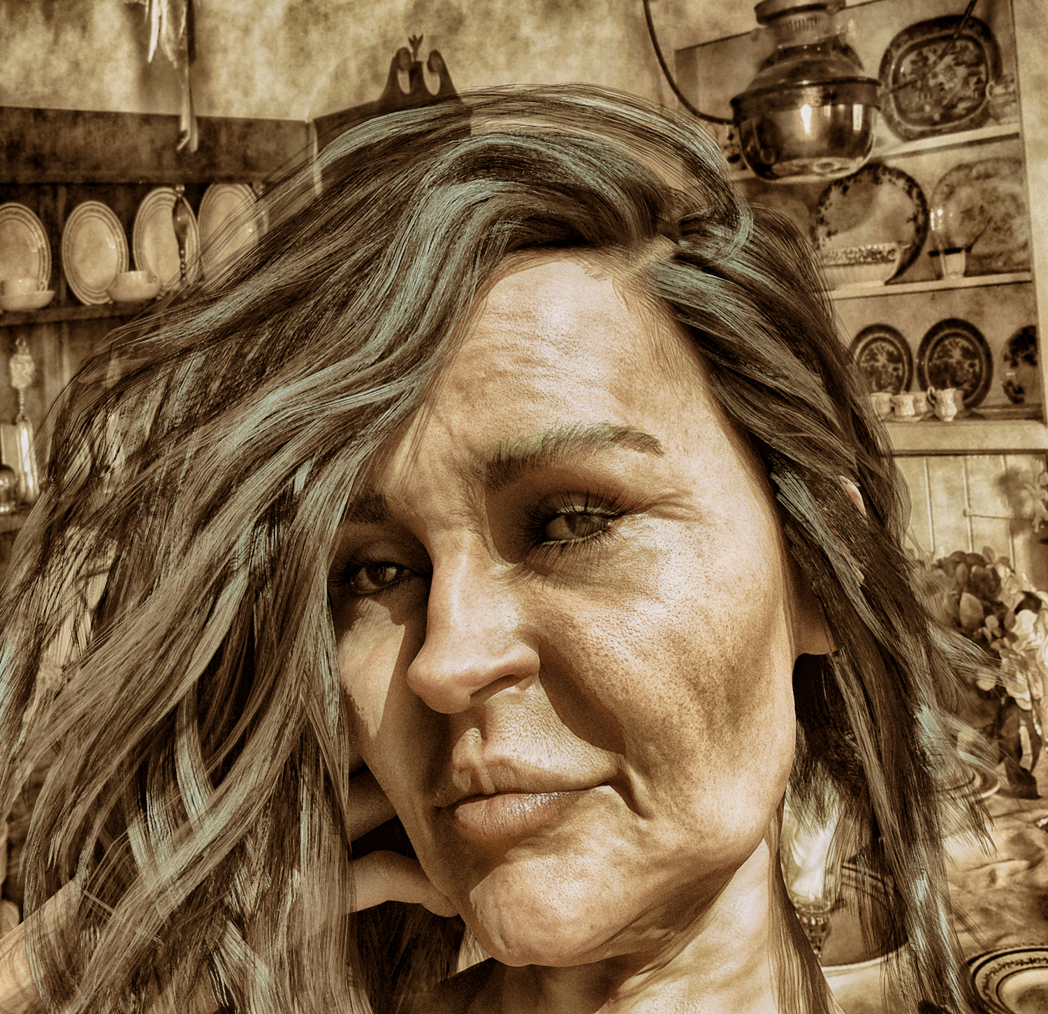 .Warum äääälter ?? Sie sah toll aus auf dem bw ! : ) . Auch das eine interessante Char Studie ! Vor allem mit dem Hintergrund. In Ihre Mimik könnte man eine Menge hinein interpretieren. Ihre Haare passen zu dem schlicht groben. Zügen. Aber das bw gefiel mir besser als sepia Auch wenn es wahrscheinlich besser mit der Küche im HG harmoniert. Haut und bump/displ.(auch Lippen) sind überzeugend für mich. Sie sieht nach einem arbeitsreichen Leben aus und ein bissl einsam. Und so richtig kaufe ich Dir das mit dem "gerade erst angefangen" nicht ab ; ). Das ist für einen "blutigen Anfänger" echt nicht übel finde ich.