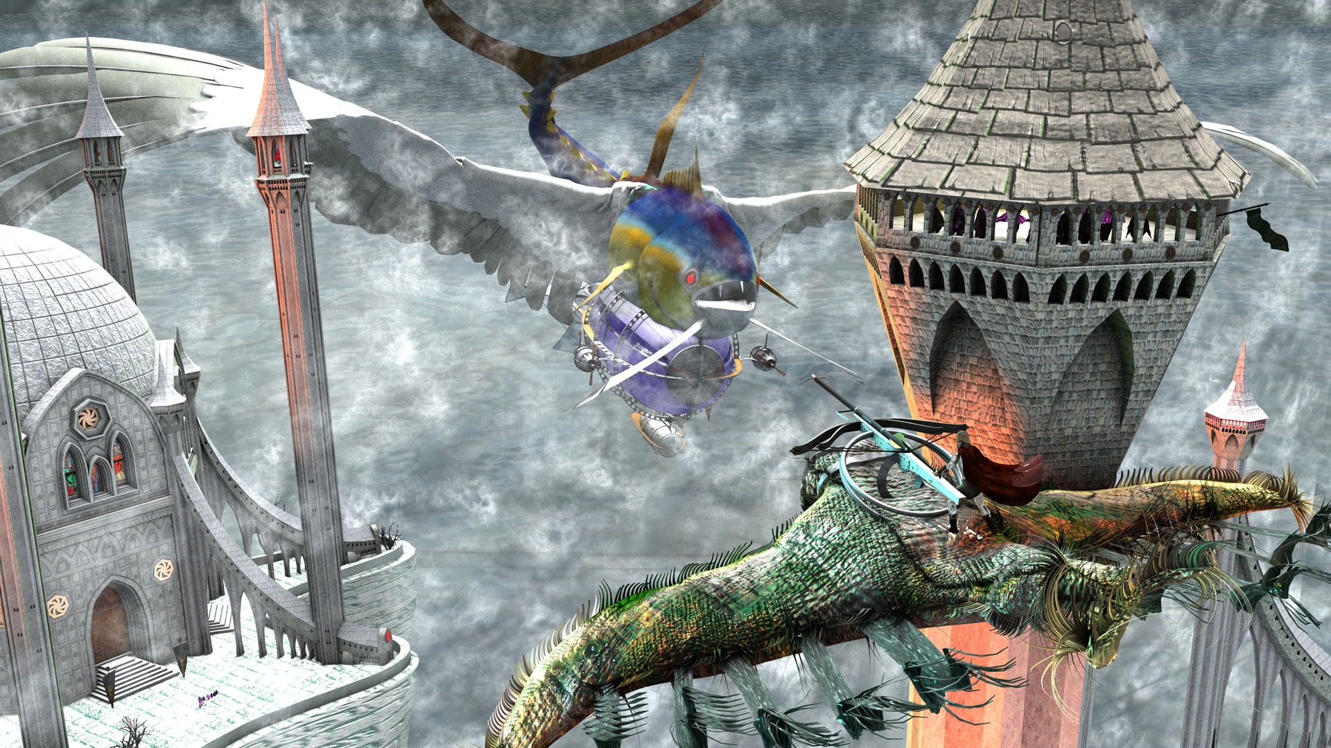 Tunafisch, Zeppelin, Crossbow aus dem DAZ Shop resp. Content Paradise, Koji von Poser. Rest selber gebastelt in C4D.