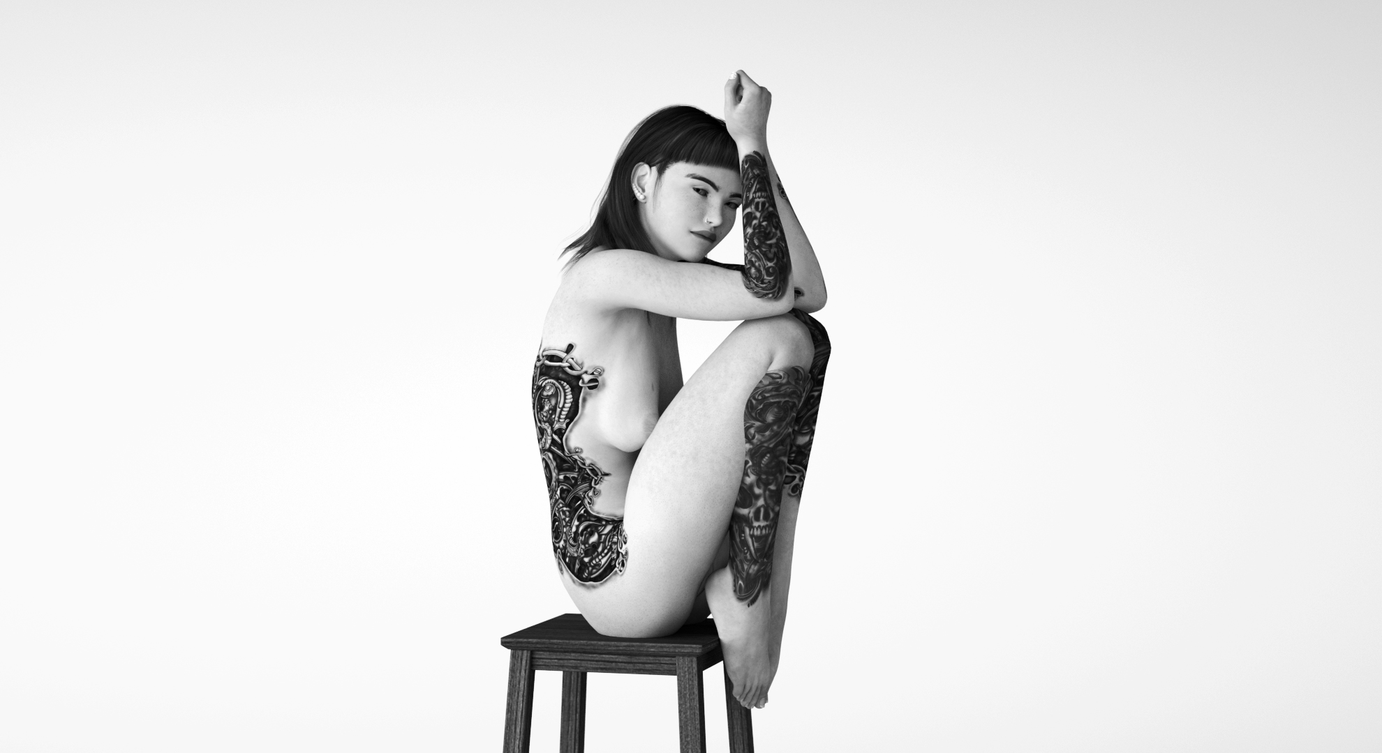 Aua! So viele Tatoos. Bloß gut das sie nur ein virtuelles Modell ist