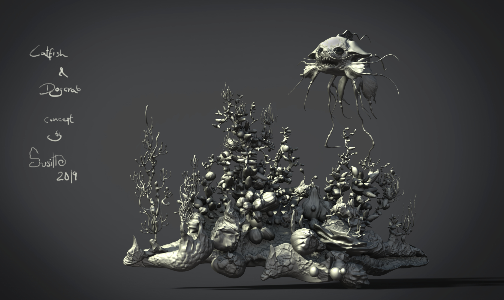 ich hab zwischenzeitlich mal ein kleines Setting für meinen Katzenfisch geknetet, er hat nun ein paar Hundekrabben zur Gesellschaft, die sich in den Korallen verstecken. geknetet habe ich die Korallen mit der Dynameshfunktion. Die Krabben und der Fisch sind Modelle mit subdevision mit zwischen10.000 und 23.000 Polys in der niedrigsten Stufe. UVs und Knochen haben sie noch nicht, ich hab sie einfach in Keyshot mit einem hübschen Material gefüllt.