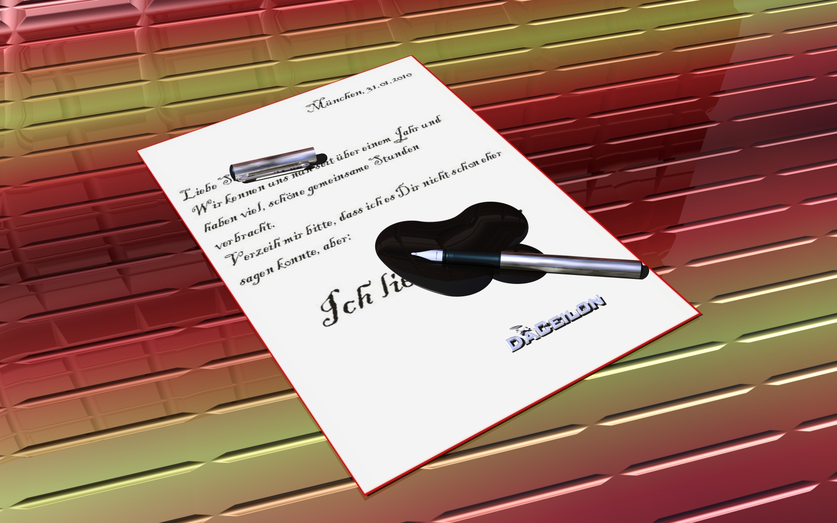 Der Füller wurde komplett in Bryce modelliert und der "Brief" ist ein 2D-Plate. Der Tintenfleck besteht aus flachen "Metaballs".