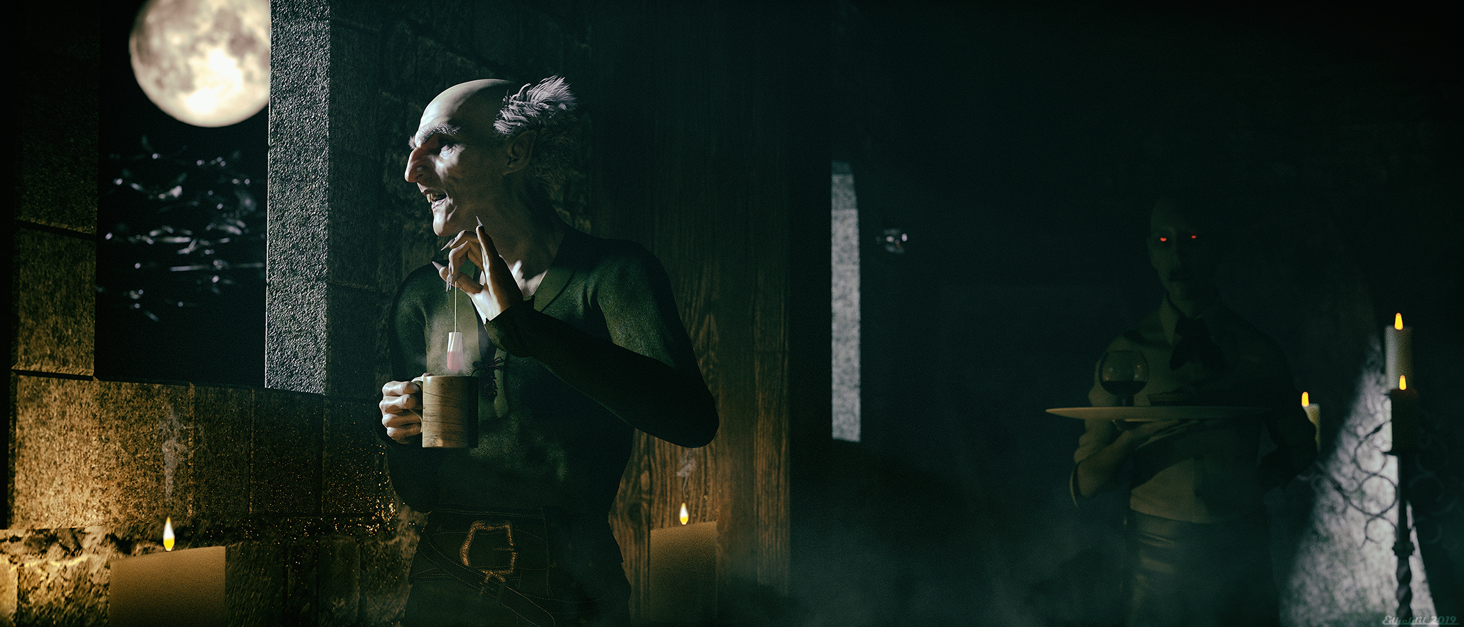 Witzig und tolle Idee. Bis auf das Licht ist hier alles stimmig, ich mag den alten Vampir.