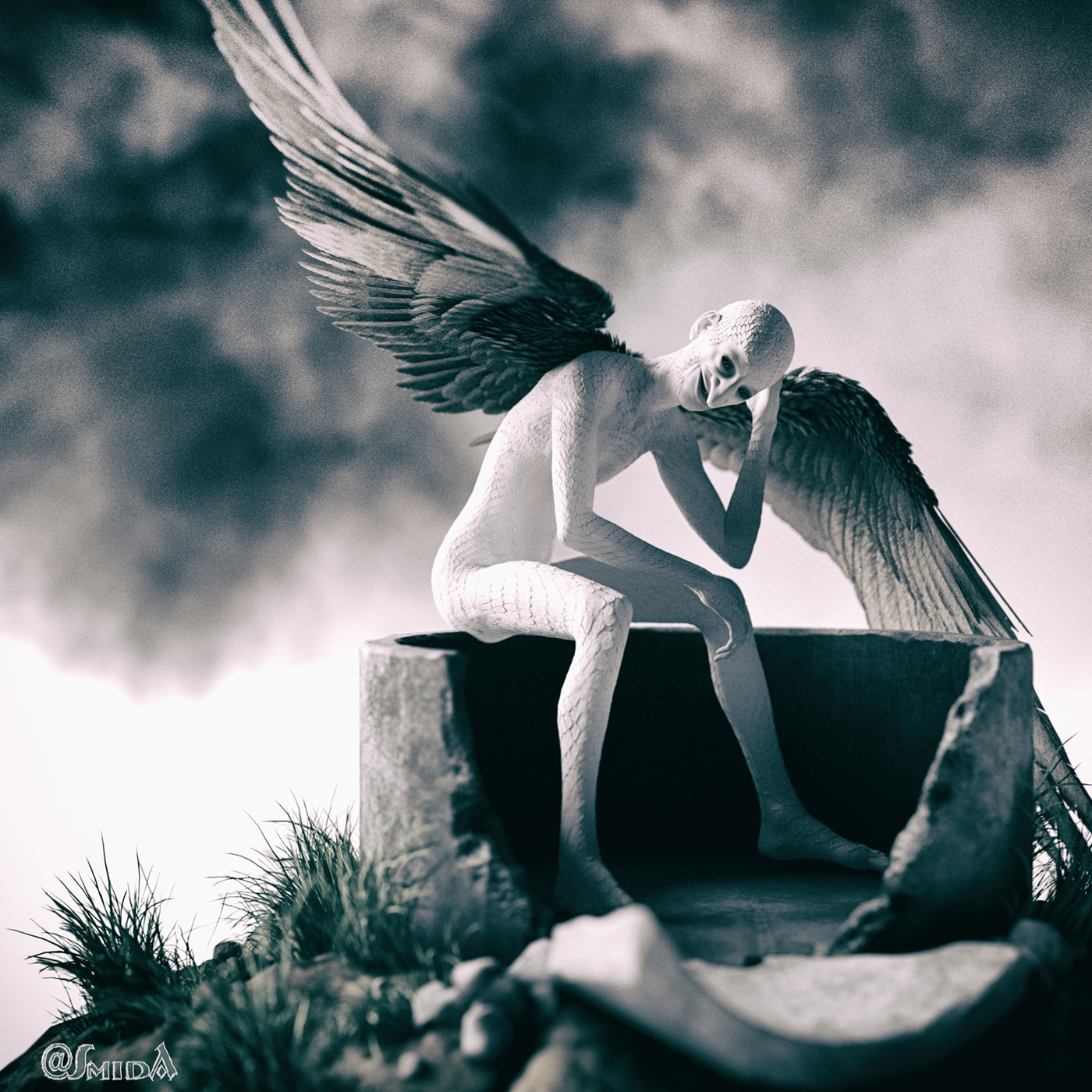 Ein sehr stimmiges Bild. Die Farbwahl (Vorder- und Hintergrund) ergeben ein harmonisches Gesamtbild, Tiefenwirkung durch leichte Unschärfe im Vordergrund perfekt. Tolle Umsetzung des Engels mit Echsenhaut.
