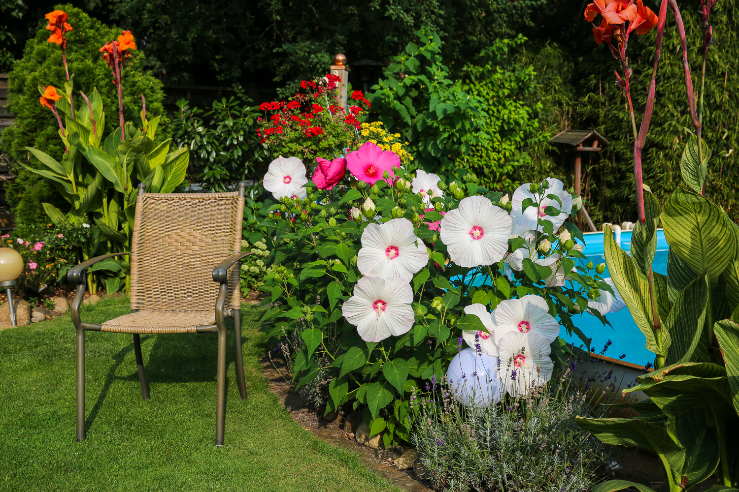 Ich habe mal einen Stuhl daneben gestellt, damit man die Suppenteller-großen Blüten besser einschätzen kann.