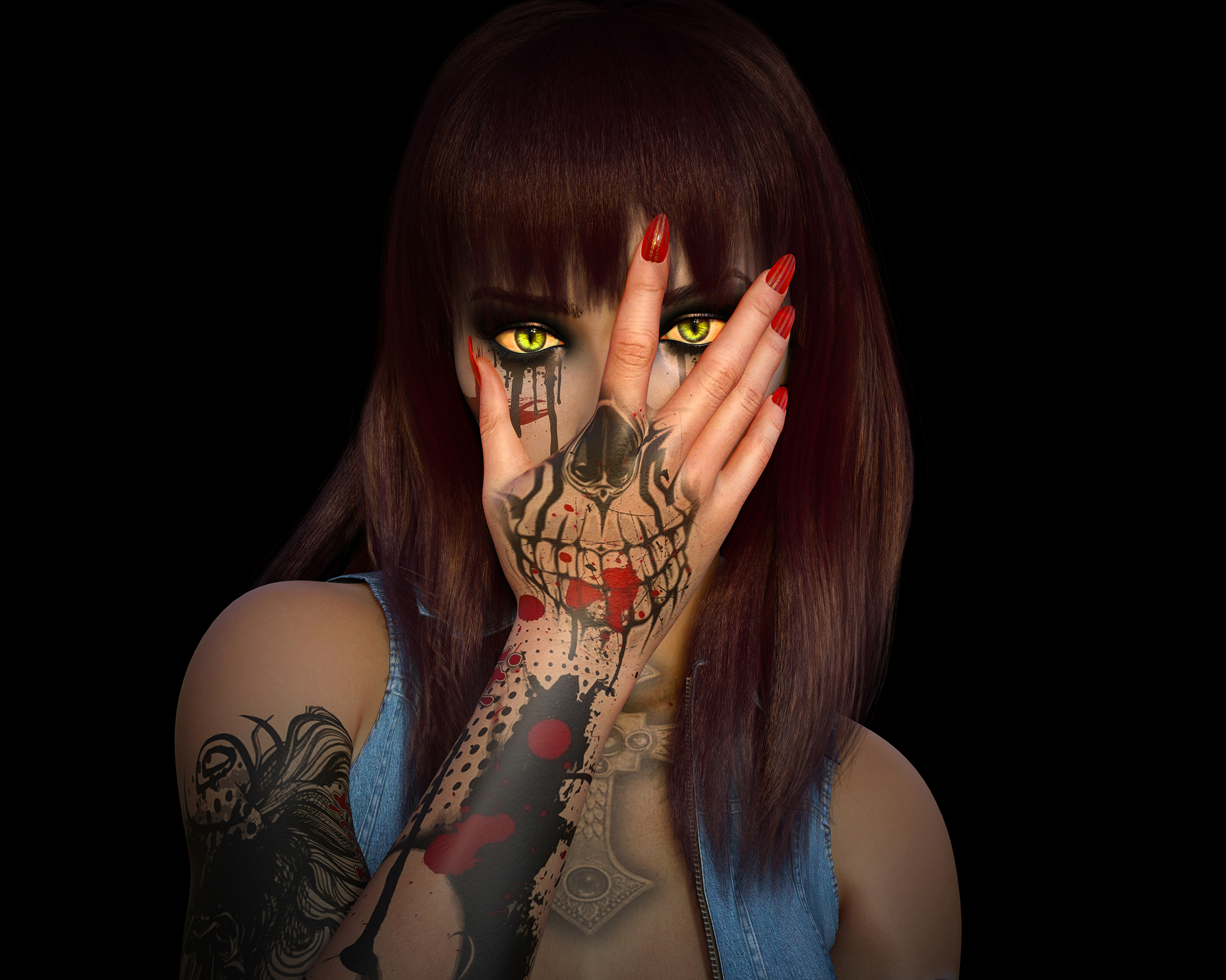 Das Tattoo auf ihrer Hand wird zum Teil ihres Gesichtes. Das hast du klasse hinbekommen.