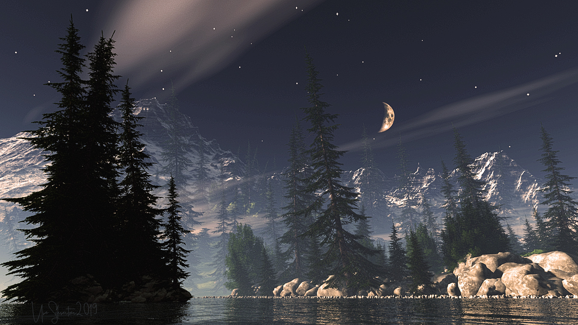 Stimmt, der Mond ist zu sehen, aber irgendwo scheint noch eine weitere Lichtquelle zu sein, die die Felsen und die Berg im Hintergund beleutet.