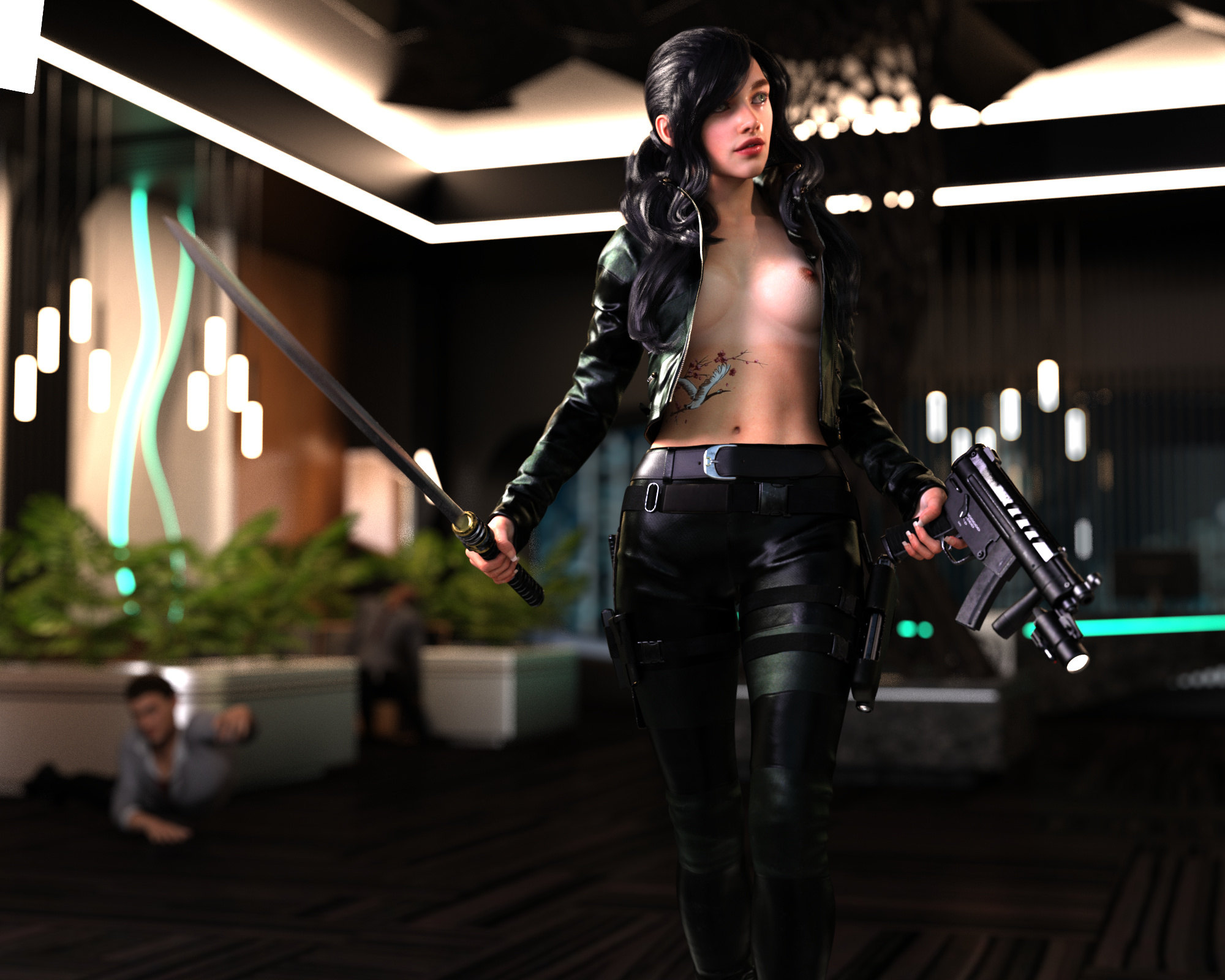 prima! - mit Maschinenpistole aber ohne Büstenhalter.
