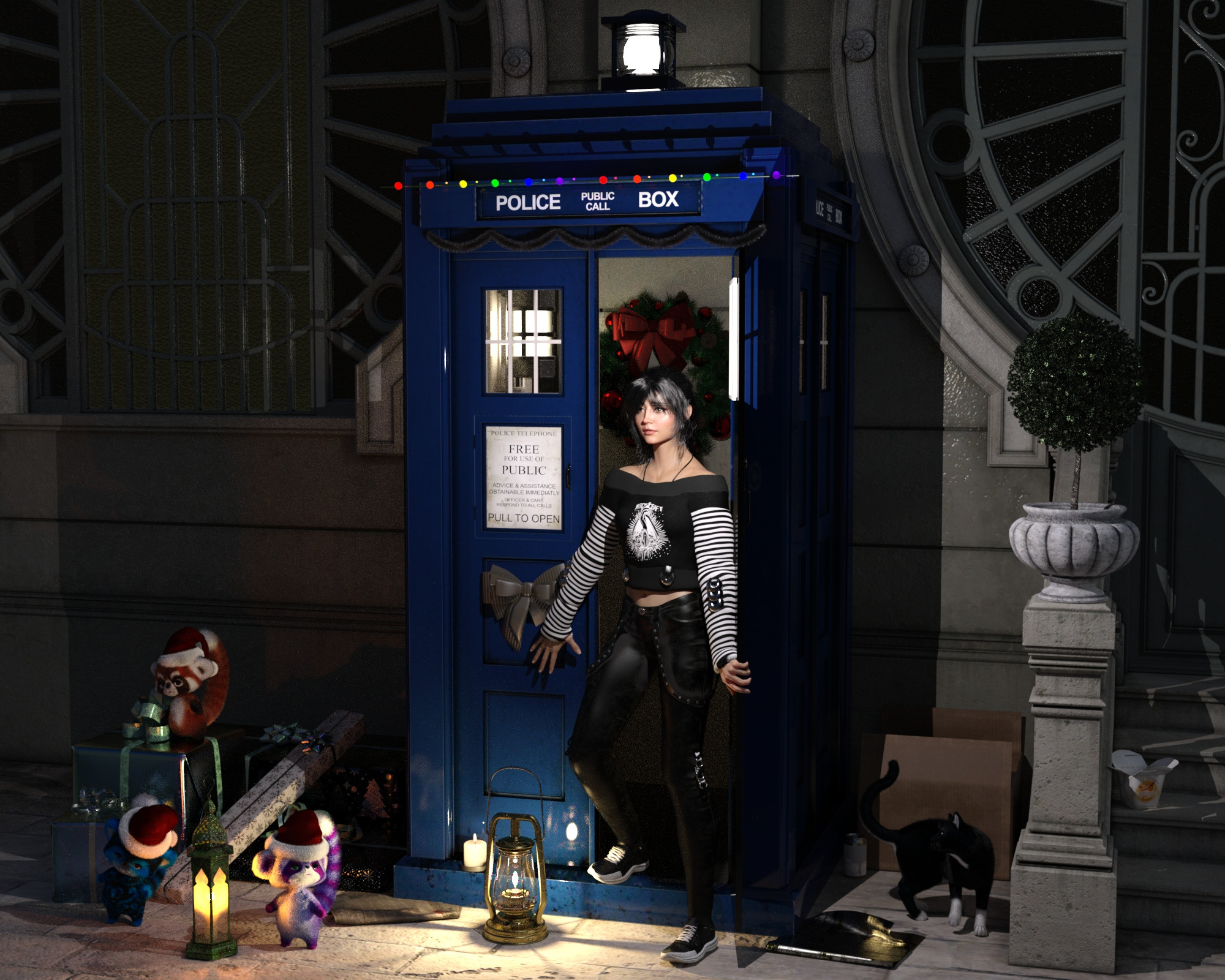 Tolles Bild!! Tolle kleine Handlung, so wie die Katze und dieses "Plüschtier" auf (ist sie Clara?) reagieren. Dein Einsatz von Kerzen gefällt mir auch jedesmal. -An Ihrem Fuss rechts ist irgendwas in der Montage falsch gelaufen (glaube ich) - Und die Police Public Call Box ist echt super.