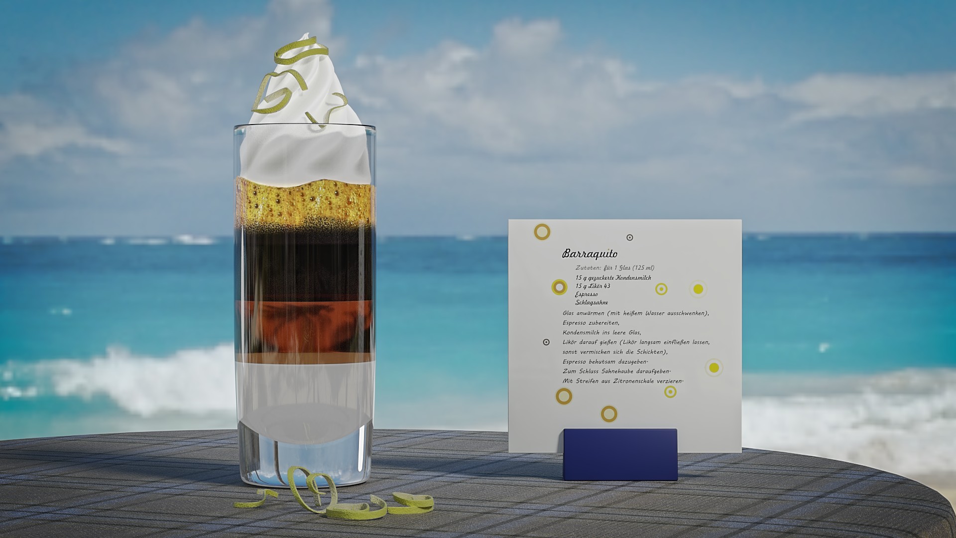 War garnicht so einfach diesen Schichttrink zu fabrizieren. Das ist keine Fluidsim, aber zum Teil Volumenmaterial. Sahne und Milch musste ich doch glatt leicht beleuchten, sonst wäre das nicht so schön hell durch das Glas gekommen. Der Espressoschaum ist eine Textur. Bloß gut das es nette Leute gibt auf Pixabay, die ihre Kaffeecrema fotografieren und ins Netz stellen