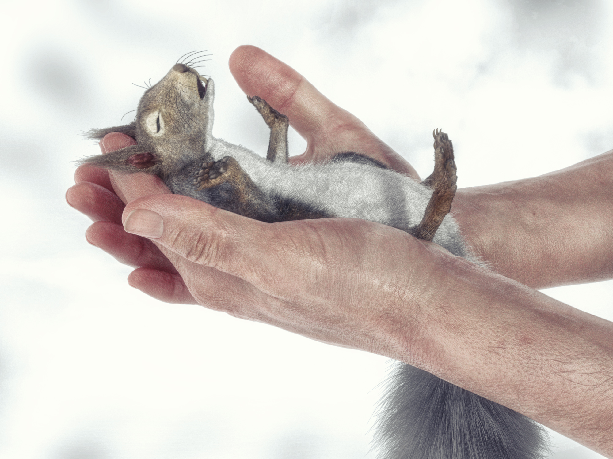 Echt stark, ich dachte erst das ist ein Foto, aber so wie ich es verstanden habe sind die Hände ein Foto und das Eichhörnchen ist CGI. Klasse!