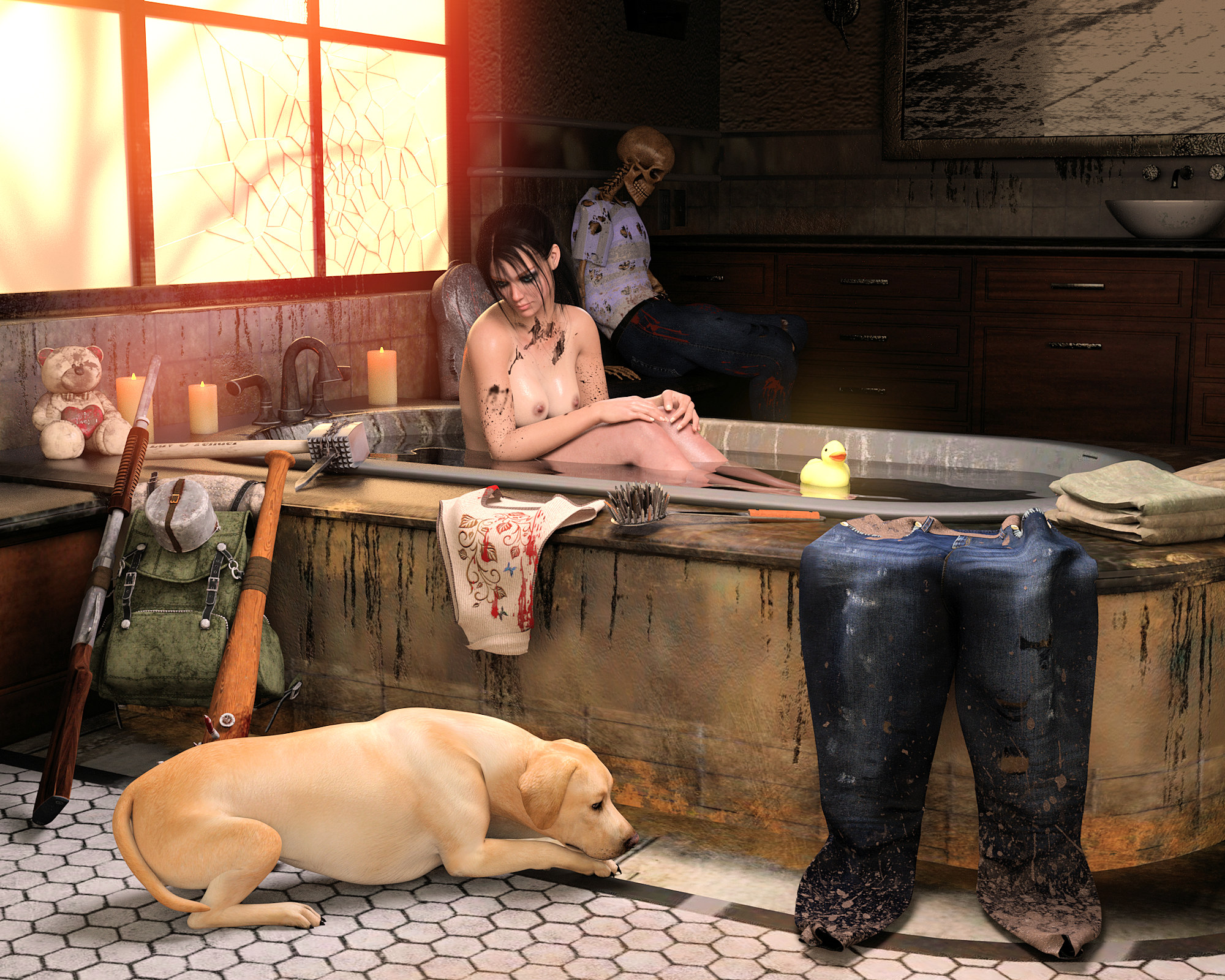 Nach wochenlangem Kampf ums Überleben und Reisen durch die zerstörte Zivilisation hatte Katharina endlich einen Ort gefunden, um sich eine Pause von der Apokalypse zu gönnen und sich all den Schmutz und das Blut vom Körper zu waschen. Selbst jetzt hatte sie ihre Waffen immer in der Nähe, da sie nie wusste, ob in der Dunkelheit nicht schon das nächste Monster darauf wartete und ihr nach dem Leben trachtete.