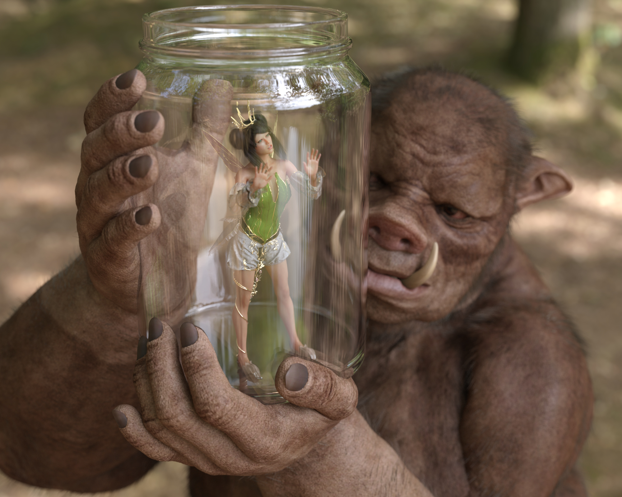 "Endlich habe ich dich", grunzte der Oger, als er sich seine Beute im Glas ansah. Es handelte sich um die Königin der Feen!