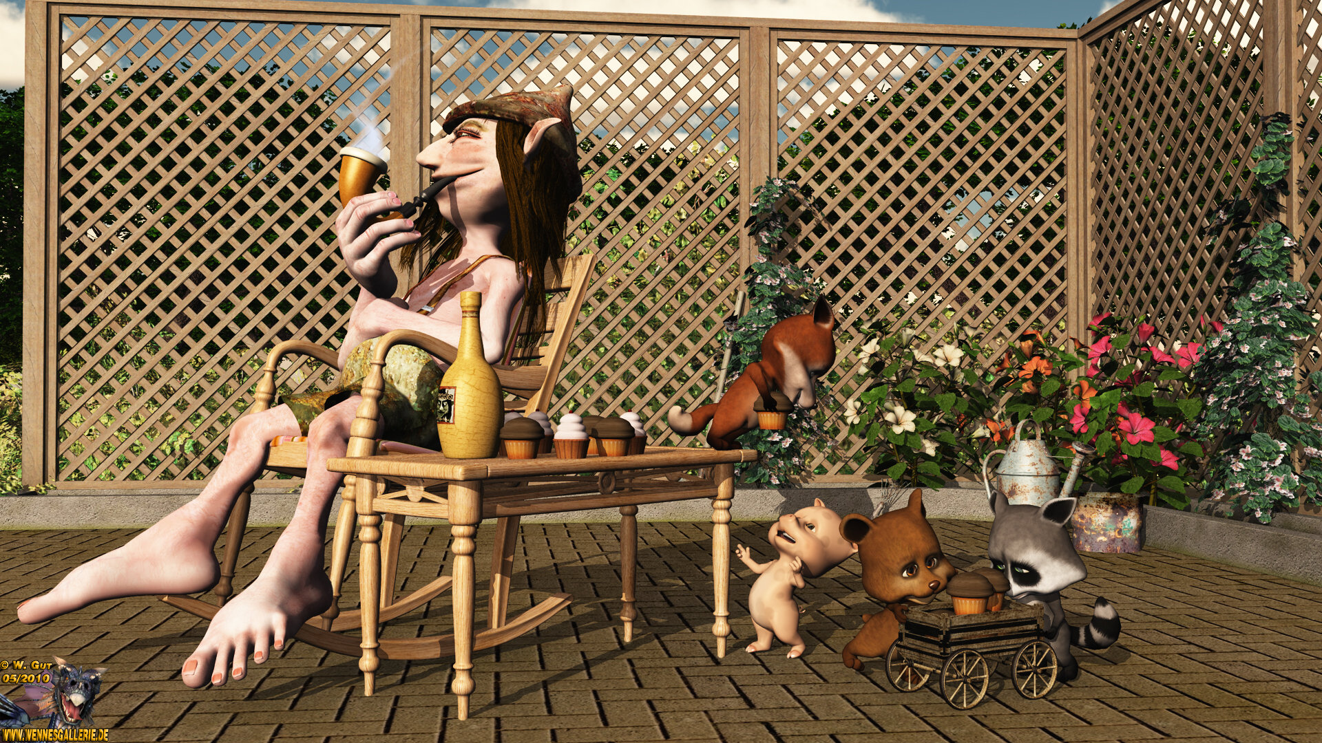 Nach halb fertig gestellter Terrassenbepflanzung gönnt sich Teo erst mal eine Pause mit Bierchen und Pfeifchen.