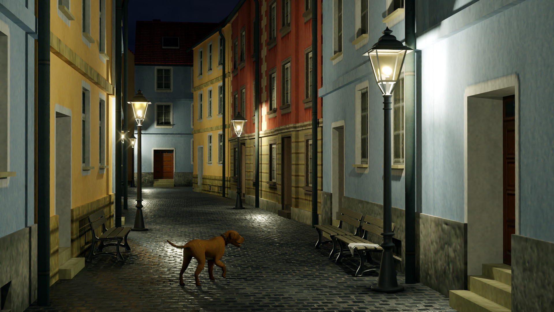 Die Texturauflösung der Gebäude ist natürlich viel zu niedrig, die Geometrie müsste ich wohl auch noch nacharbeiten. Wie gesagt, Low Poly Zeug, nie dafür gedacht in einem Still verarbeitet zu werden. Das Ergebnis landet aber im neuen Splashscreen von Bforartists. In einer Grösse von 501x282 Pixeln. Die Details sieht man da schlicht nicht mehr. Also bleibt es so.