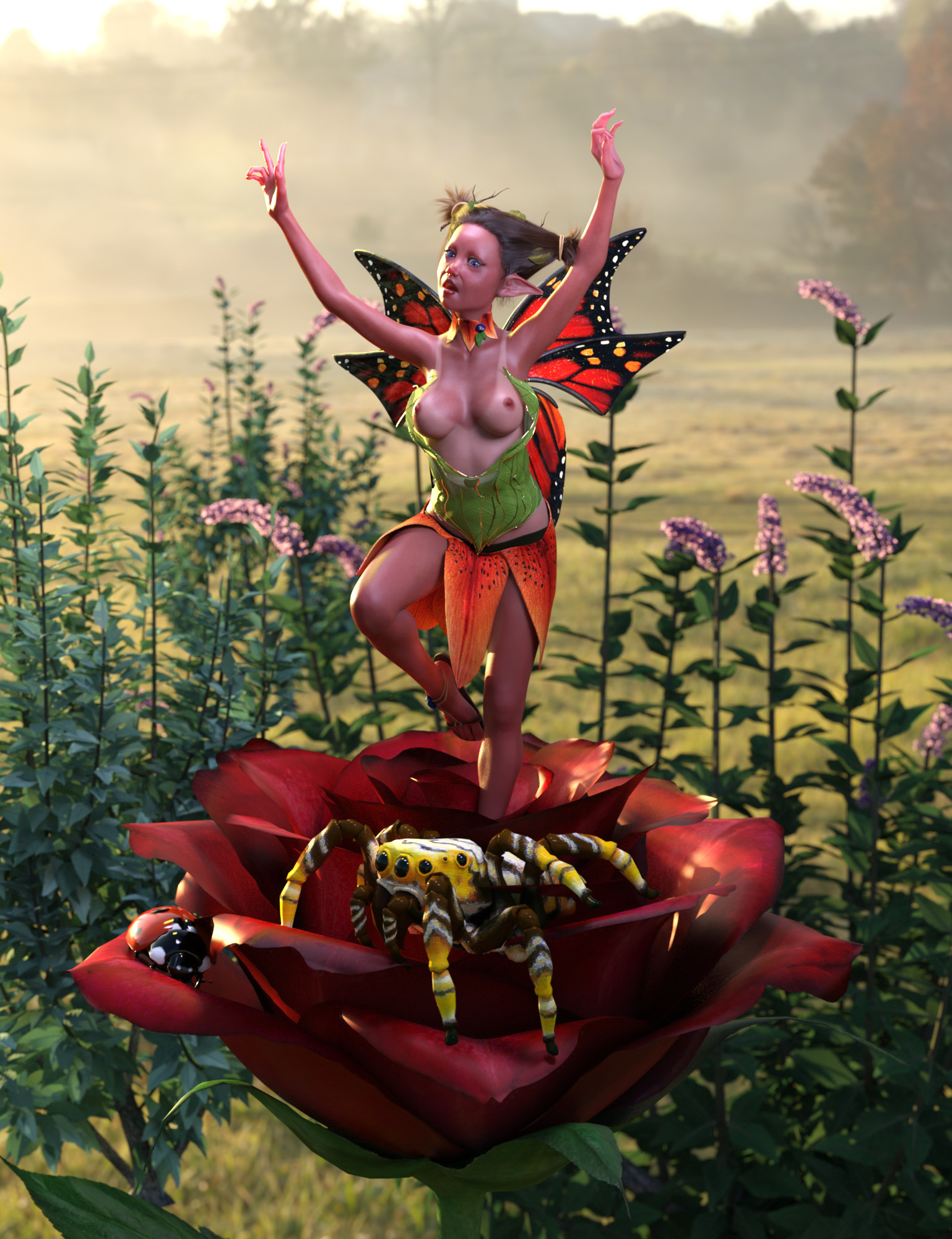 "Huch", schimpfte die junge Fee, als sie vor einer Spinne floh. Sie war wohl etwas zu hastig abgehoben und bemerkte gerade, dass ihre Kleidung verrutscht und ihre Brüste zu sehen waren. "Hoffentlich hat der Marienkäfer das nicht gesehen", dachte sie, während sie sich ihr Oberteil wieder zurecht rückte und davon flog...