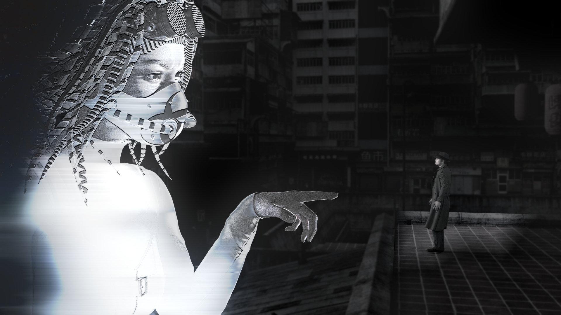 Dieses riesige, leuchtend helle Hologramm (?) in dieser ansonsten dunklen Atmosphäre des Bildes ist mächtig. Wie muss sich dieser arme Mann fühlen, der da direkt davor steht?!