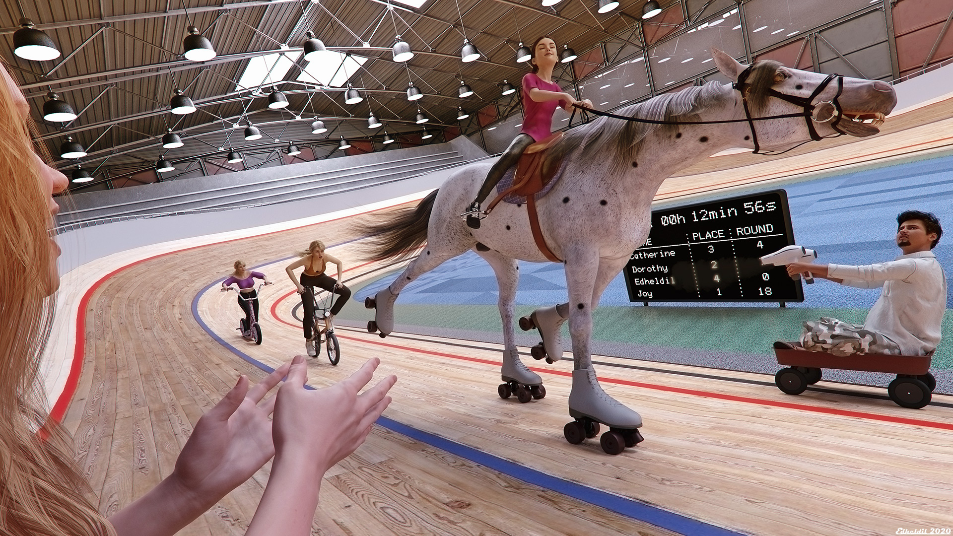 In dem Fall gibt's wirklich einen Auslöser. Auf dem Heimweg bin ich an einer alten Pferderennbahn vorbeigekommen, die schon lange nicht mehr genutzt wurde. Jetzt hat man die Rennstrecke 'geteert' und ich hab mich gefragt, wie das wohl jetzt mit den Pferden klappt. Und ein paar Gedankensprünge weiter war schon die Bildidee geboren.