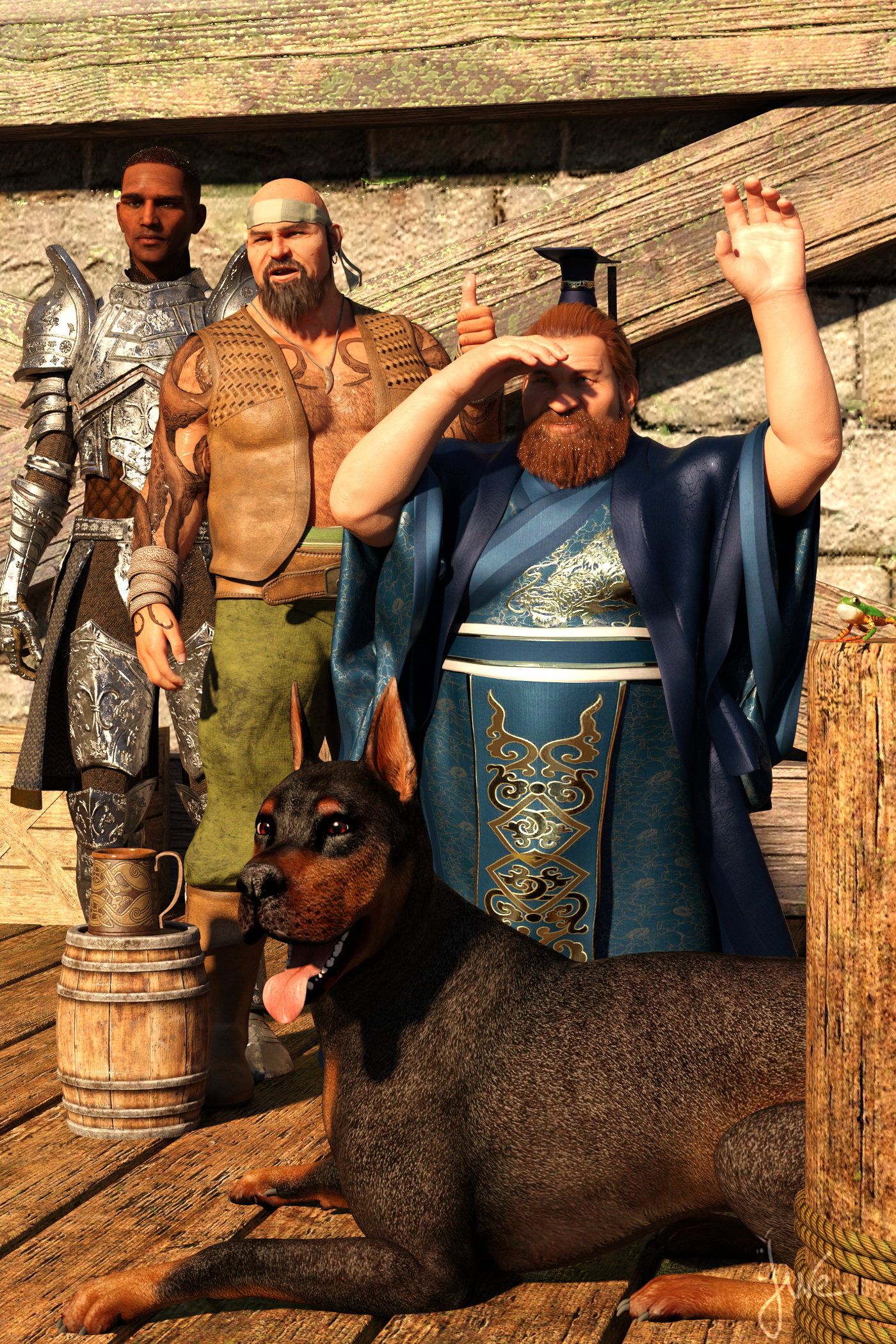 Der in Blau ist ein zwergischer Kleriker, der das Schiff nur begrüßt, weil er zufällig vor Ort ist. Der Mann mit dem Fässchen und dem Humpen neben sich ist der Patient aus der Geschichte