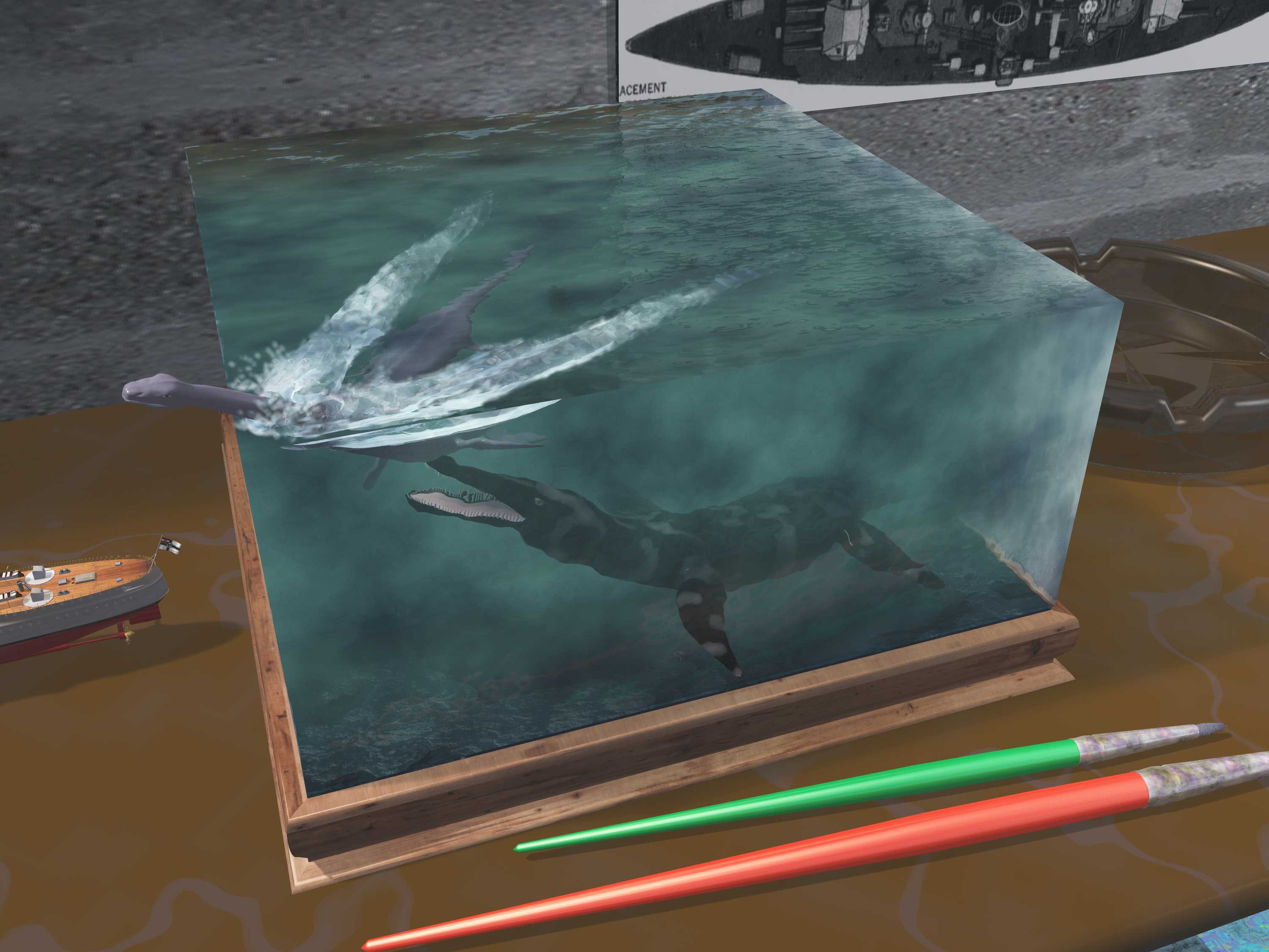 • Ichthiosaurier und Plesiosaurier . Der Ichthio ist eigentlich schon vor 172 Mio Jahren ausgestorben. Der Plesio lebte von 162 Mio bis 65 Mio Jahren vor unserer Zeit. Er ist also mit dem großen Sauriersterben über den "Großen" Teich gegangen.