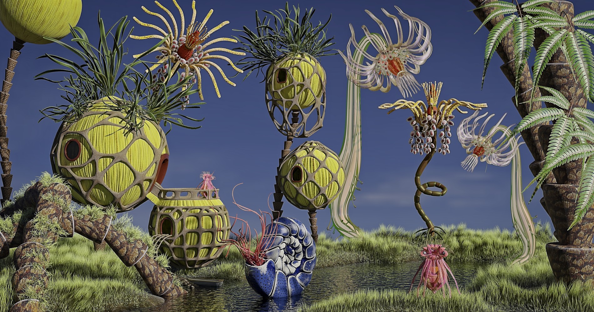 Das war mein Beitrag zum Blendpolis-Contest vom September mit dem Thema Fantasie-Landschaft. Neu dazu gemacht habe ich nur die Wohnkugeln, der Rest sind Haeckel-Objekte. Wie immer mit Blender und Cycles.