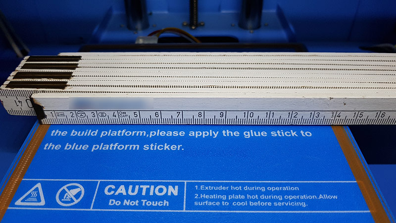 Das beschichtete Aluminium-Druckbett hat eine Abmessung von 150 x 150 mm. Der Druckbereich ist mit 145 x 145 x 145mm angegeben, den ich im Test bestätigen konnte. Tatsächlich war bei einem Layer-Test von exakt 145 x 145 mm auch noch ein Skirt mit einem Abstand von 1mm möglich.