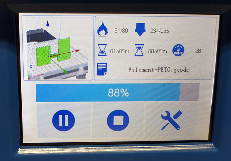 Im Übrigen ist der Drucker sehr einfach zu Handhaben. Auch das Wechseln des Filaments (vorheizen der Düse nicht vergessen) geht dank der intuitiven Menüführug über das Touchdisplay leicht von der Hand.