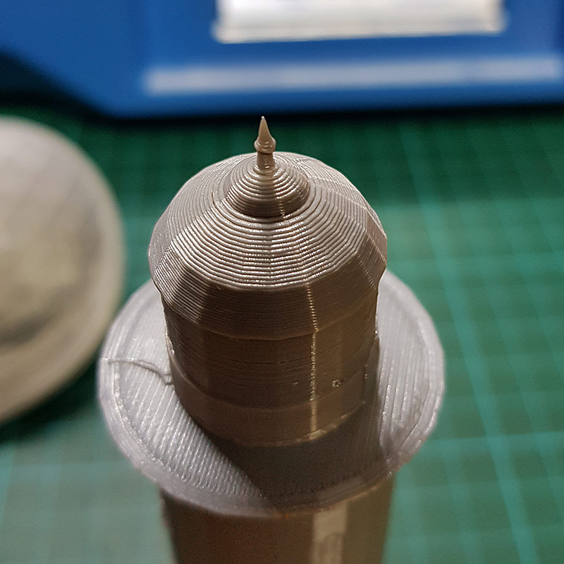 Bei dem Druckergebnis ist gut sichtbar, dass die beim Rendern durch die Software vorgenommene Glättung beim 3D-Druck nicht ohne weitere umgesetzt wird. Man sollte daher die Modelle möglichst in High-Poly in den Slicer geben. Ebenso muss man daran denken, dass Details, die beim Rendern durch Bump- und Normal-Maps erzeugt werden, natürlich beim 3D-Druck entfallen. Man sollte daher alle Details, die gedruckt werden sollen, auch wirklich modellieren. Schließlich muss man darauf achten, bis zu welcher minimalen Größe die jeweils verwendete Düse Dateil noch drucken kann. Das Geländer des Turms um die obere Plattform z.B. war zu klein, so hat bereits die Slicer Software das Geländer entfernt. Die Spitze hingegen ist gut gelungen.