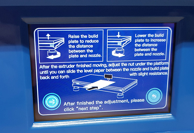 Druckbett-Ausrichtung - Anleitung auf dem Touchscreen und Level-Papier zwischen Druckbett und Druckkopf