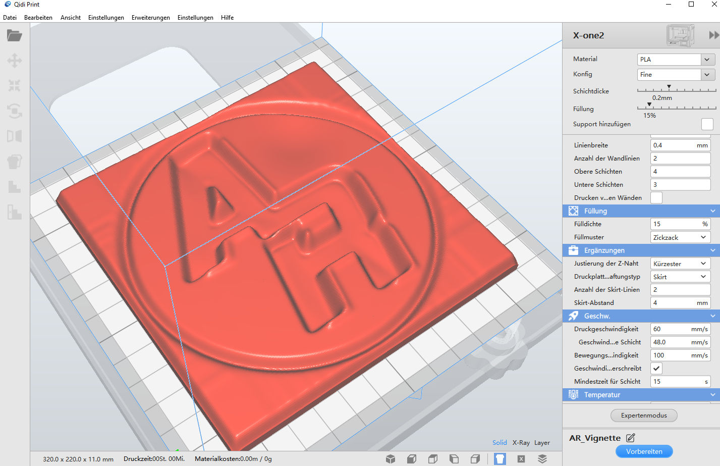 Die Anpassung von Temperatur, Flussgeschwindigeit und anderen Parametern an das jeweilige Material ist für ein gutes Druckergebnis wichtig. Tatsächlich bin ich bei dem X-One2 von Haus aus mit den vom Programm vorgeschlagenen Standard-Einstellungen stets gut gefahren. Das Programm hat für verschiedene Materialien Presets hinterlegt. Wenn man ein paar Objekte gedruckt hat, kann man dann anfangen ein wenig mit den Werten zu spielen, um noch bessere Ergebnisse auch bei komplexen Objekten mit vielen Feinheiten zu erreichen.