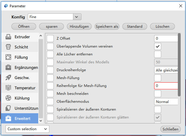 Im „Expert mode“ können zahlreiche Parameter für den Druck angepasst werden, um so für das jeweilige Material und das zu druckende Modell das beste Ergebnis erreichen zu können.