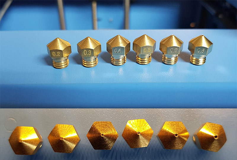 Wie bereits erwähnt, hat der X-one2 von Haus aus eine 0,4mm Düse. Wer schnellere Drucke oder feinere Details im Druck haben möchte, kann - neben dem Feintuning in der [definition='2','[object Object]'][definition='2','[object Object]']Slicer-Software[/definition][/definition] - auch eine andere Düsengröße einsetzen. Dabei bedeutet eine halbierung des Düsendurchmessers (von 0,4mm auf 0,2mm), dass nicht die Hälfte, sondern nur 25% des Filamens einer 0,4er Düse. Dadurch schnellt die Druckzeit in die Höhe und durch die dünneren Schichten kann - ohne Anpassung der Druckparameter - die Stabilität leiden. Schließlich erhöht eine Verringerung der Düsenöffnung auch das Risiko einer verstopften Düse. Vergößert man die Düsenöffnung hingegen, wird weniger Zeit für den Druck benötigt. Dies geht allerdings zu Lasten feiner Details und erhöhnt den Filamentverbrauch teilweise erheblich. Gleichzeitig wird allerdings das Risiko einer verstopften Düse verringert. Dennoch wollte ich es ausprobieren und vor allem wissen, wie einfach ein Düsenwechsel beim X-one2 von Statten geht. Dazu habe ich mit ein passendes Set mit 6 verschiedenen Düsengrößen (0,2 - 0,3 - 0,4 - 0,5 - 0,6 und 0,8mm) bestellt. Wichtig ist, dass man darauf achtet, dass die Düsen ein M7 Gewinde haben müssen und passend für den MK10 Extruder sein sollten.