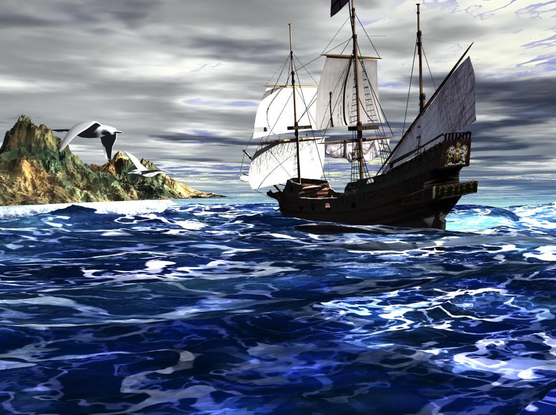 der himmel und das wasser wollen nicht so richtig zusamen passen^^ auch stehen im wasser noch *ecken*hoch. das letzte terrain vergössern und schiebe es weiter nach hinten und heb dann die hintere kante leicht an ( schräg stellen) so das nur wenig am horizont davon zu sehen ist, ganz vorne senkt du es nach leicht unten, vielleicht verdrehst auch mal einwenig sonne, das topsegel ist zu stark angestrahlt. mach mal schön weiter so, ist schon beachtlich für deine erste wellen