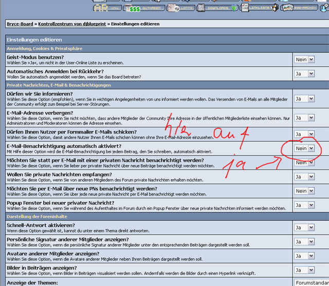 Und wegen der eMail-Benachrichtigung: Du kannst das bei jedem Posting separat einstellen. Standardmäßig ist es ausgeschaltet, du musst also erst den Haken setzen.