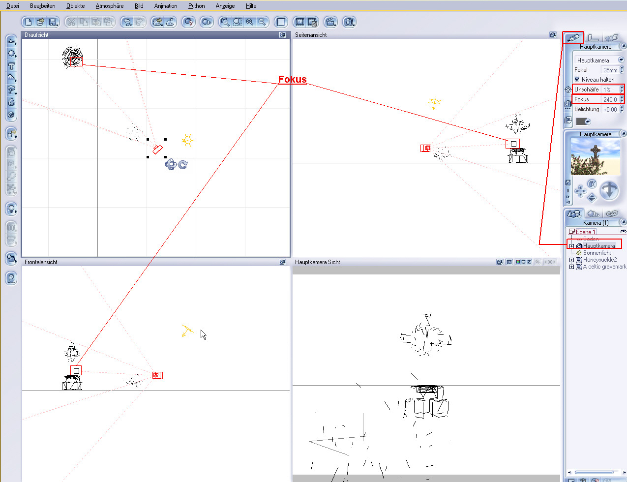 Also, bei Vue5Infinite markierst du erst einmal deine Hauptkamera und verschiebst das kleine Viereck davor in den verschiedenen Ansichten da hin, wo du das Bild scharf haben willst. Dann stellst du bei den 'Materialeinstellungen' der Kamera die Unschärfe ein, die du willst. Aber sei vorsichtig. Erstens genügt nur eine geringe Einstellung um Sachen, die etwas weiter vom Fokus weg sind unscharf zu machen und zweitens erhöhen sich die Renderzeiten furchtbar. (ähnlich wie bei Bryce!) ![]()