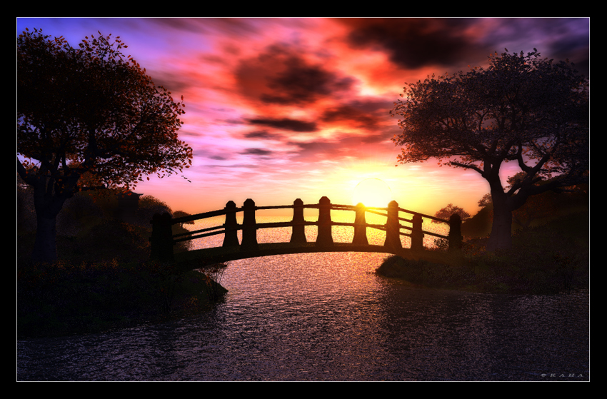 Die Farbvariante gefällt mir am besten. Die Stimmung ist hervorragend. Ich bin mir nur nicht so sicher ob die Geländerpfosten nicht zu stark für so eine filigrane Brücke sind. Irgendwie habe ich den Eindruck dass die Proportionen gestört sind.