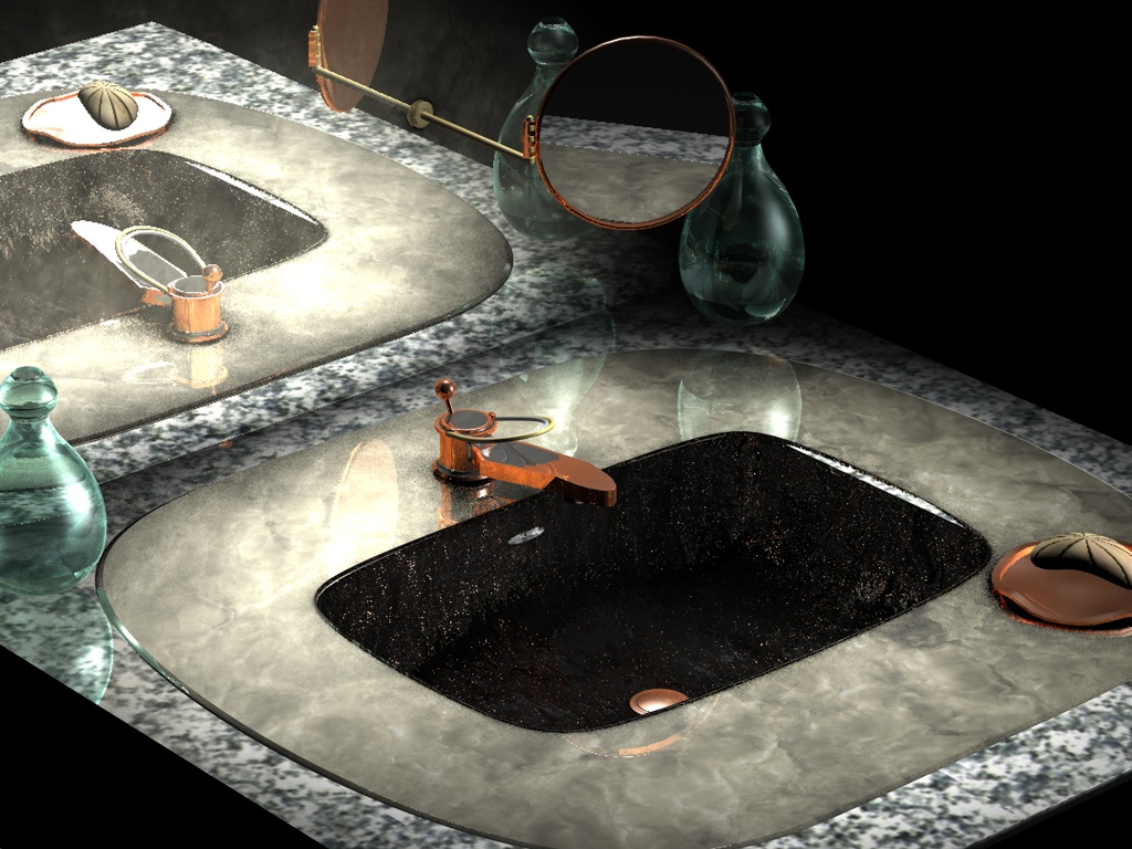 das fällt schnell ins auge sobald man sich ins bild vertieft. die seife in der ablage könnt vielleicht auch noch ne leichte spiegelung im kupfermetall darunter vertragen, sonst sieht das irgendwie freigestellt oder drauf"geklebt" aus..