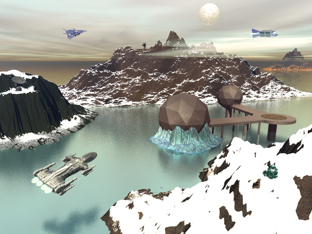 ich hab mich nun zum ersten Mal an ein spaciges Thema rangetraut. Dabei hab ich mich, bis auf das Raumschiff, auf die Standardobjekte die im Bryce enthalten sind beschränkt. Wollte mal sehen was sich damit so anstellen lässt.