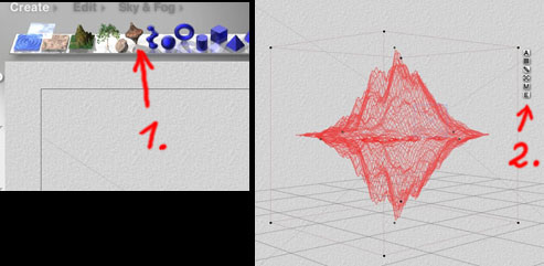 Jetzt gehst Du der Reihe nach die nummerierten Schritte durch (Mit Punkt 4. kannst Du die noch etwas verzerrte Form flacher machen und nachglätten ( mit der Maus auf das Knöpfchen, festhalten und nach rechts ziehen = flacher machen. Drauf klicken setzt den maximalen Wert, in diesem Falle Null Höhe, also bliebe dabei von Deinem Terrain nichts mehr übrig, daher ist bei diesen Buttons in der Regel vorsichtiges Ziehen die bessere Wahl ). Nachdem Du mit 5. bestätigt hast findest Du im Arbeitsfenster -zunächst flach liegend, weil es ja ein Terrain ist- Deinen Stamm. Richte ihn mit dem Drehwerkzeug auf und zieh ihn noch etwas in die Länge, Textur drauf und fertig)