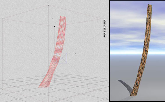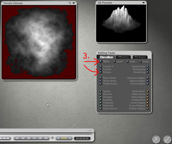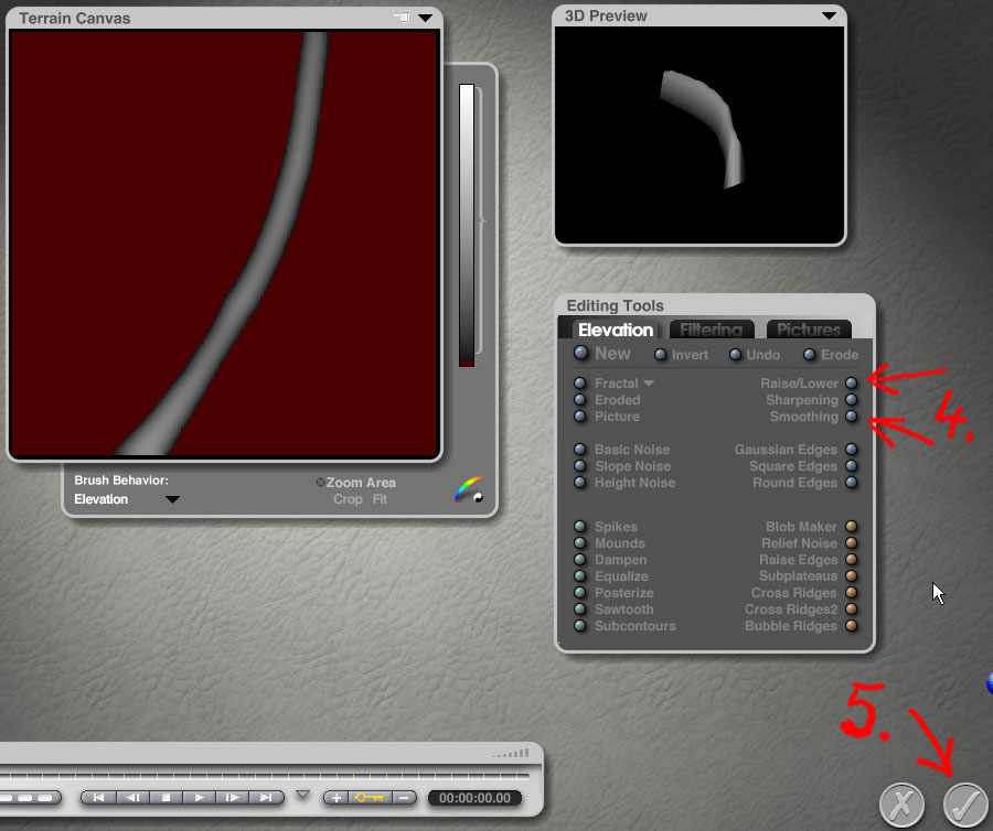 Jetzt gehst Du der Reihe nach die nummerierten Schritte durch (Mit Punkt 4. kannst Du die noch etwas verzerrte Form flacher machen und nachglätten ( mit der Maus auf das Knöpfchen, festhalten und nach rechts ziehen = flacher machen. Drauf klicken setzt den maximalen Wert, in diesem Falle Null Höhe, also bliebe dabei von Deinem Terrain nichts mehr übrig, daher ist bei diesen Buttons in der Regel vorsichtiges Ziehen die bessere Wahl ). Nachdem Du mit 5. bestätigt hast findest Du im Arbeitsfenster -zunächst flach liegend, weil es ja ein Terrain ist- Deinen Stamm. Richte ihn mit dem Drehwerkzeug auf und zieh ihn noch etwas in die Länge, Textur drauf und fertig)